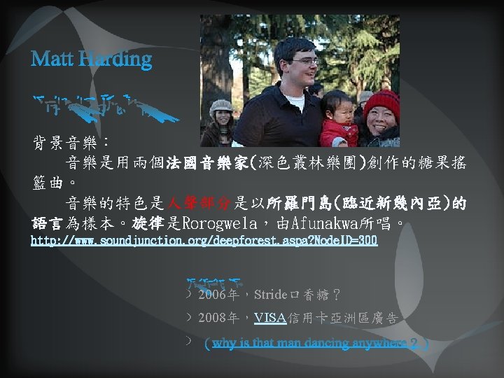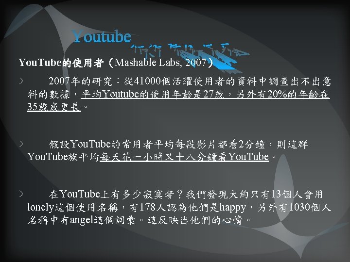 Mashable Labs (Are You an Average You. Tube User? 2007, Kelvin) 影響使用者利用You. Tube 分享影片因素之研究(交大張錦梅, 碩士論文 2009, 1) 《You. Tube-digital media and society series》(Jean Burgess & Josjua Green 2009) ELLE:從 作出走的旅行者:Dancing with Matt Harding(2009. 1. 9) Youtube功能介紹 新華網(You. Tube再造網絡財富神話 2006. 10. 14) 陳士駿: Web 3. 0、中文版You. Tube、用手機看You. Tube短片(2007. 6. 11) Excellent財團法人卓越新聞基金會 (Youtube知多少?媒體素養隨之面臨的新興議題2008. 8. 29) cn. Beta中文業界資訊站 (You. Tube搜索关键词: Sex居前三2008. 11. 24)