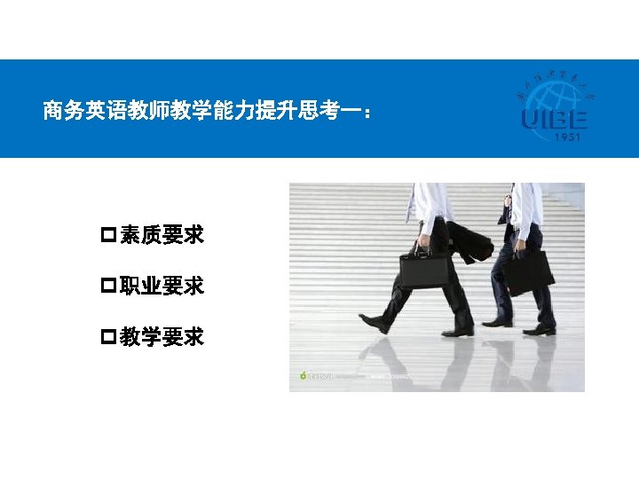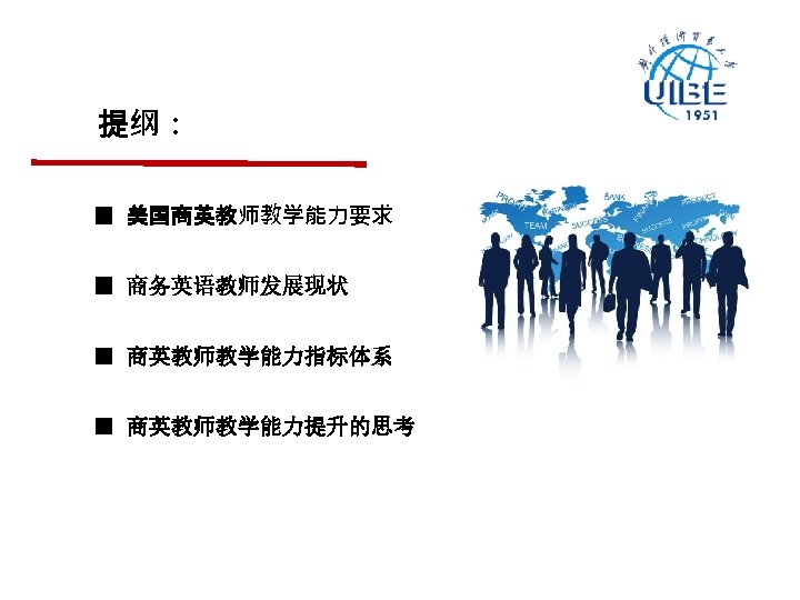 美国的商务英语教师技能要求 1. Speaking — Talking to others to convey information effectively. 2. Reading Comprehension — Understanding written sentences and paragraphs in work related documents. 3. Instructing — Teaching others how to do something. 4. Active Listening — Giving full attention to what other people are saying, taking time to understand the points being made, asking questions as appropriate, and not interrupting at inappropriate times. 5. Critical Thinking — Using logic and reasoning to identify the strengths and weaknesses of alternative solutions, conclusions or approaches to problems.