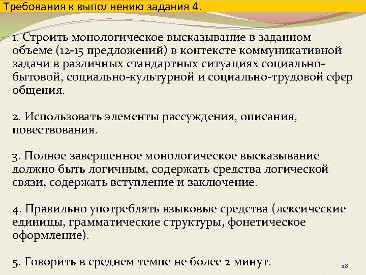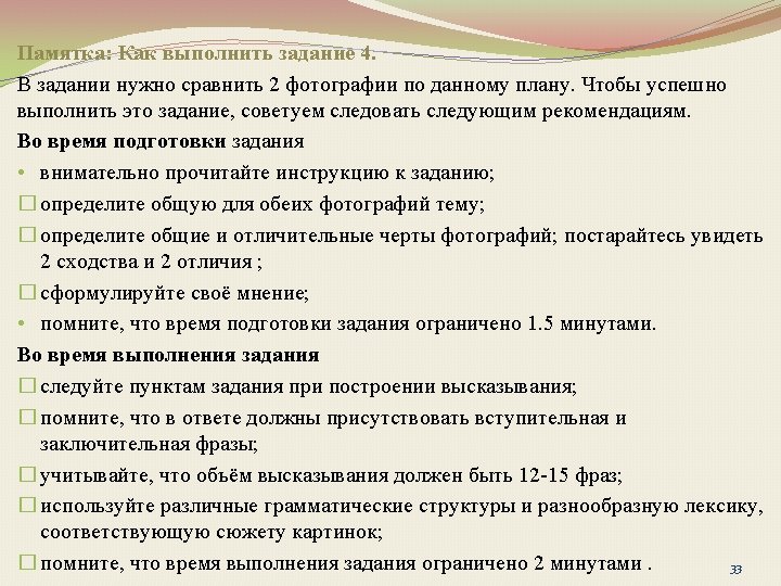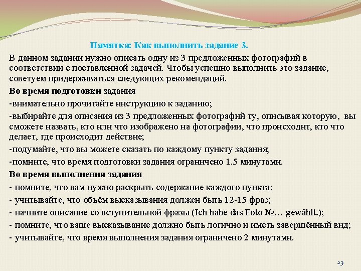 Задание 3 • Ich habe das Foto №… gewählt. Ich habe … viele Fotos gemacht. Das war in … (Wir waren in …) • Auf diesem Foto sind … Sie sind … Im Vordergrund (Hintergrund) … • … Das macht … Spaß. Alle haben gute Laune. • Darum habe ich dieses Foto gemacht. Ich bin unbemerkt geblieben, deshalb ist dieses Foto natürlich gelungen. Mir gefällt es auch. • Und ich habe beschlossen, das Foto zu zeigen. Dieses Foto wird als schöne Erinnerung an … bleiben. Zum Schluss kann man sagen, dass … …. .