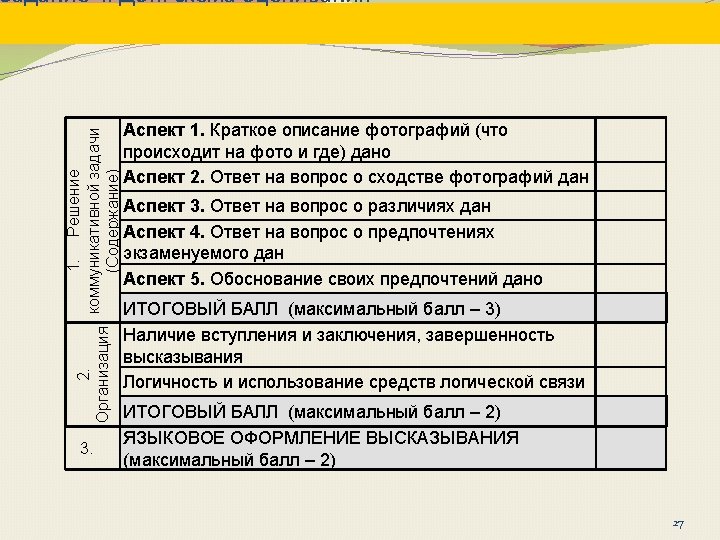 Задание 4 • Ich habe zwei Fotos zum Vergleich. Die Fotos sind dem Thema … gewidmet. Hier sind … dargestellt. • Auf beiden Fotos sind. . Sie …. … • Auf dem ersten Foto … Auf dem Foto № 2 … … • Ich mag… Mir gefällt, … zu … Es ist für mich … • Das macht mir Spaß. Mit Vergnügen … ich … Zum Schluss kann man sagen, dass … … …. .