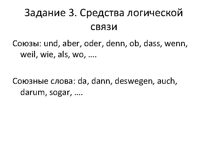 Задание 4. Средства логической связи Союзы: und, aber, oder, wenn, weil, obwohl, wenn, dass, die / der / das, denn, während, wie, sowohl … als auch, …. Союзные слова: auch, dann, trotzdem, dagegen, ….