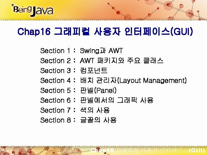 2. AWT 패키지와 주요 클래스 1. java. awt 패키지 ü GUI 구축을 위한 클래스들의 모임 ü java. awt 패키지에서 제공되는 클래스들의 유형별 분류 유형구분 컴포넌트의 배치와 관 련된 클래스명 Border. Layout, Flow. Layout, Grid. Bag. Constraints, Card. Layout GUI 구성과 관련된 클 Button, Label, Canvas, Checkbox, Choice, 래스 Scrollbar, Component. List, Menu, Text. Component, Text. Area, Menu. Bar, Menu. Item, Text. Field, Checkbox. Group, Checkbox. Menu. Item, Menu. Component 그래픽 출력과 관련된 클래스 Color, Font. Metrics, Rectangle, Point, Polygon, Graphics, Image 컨테이너 클래스 Frame, Panel, Window, Container, File. Dialog, Dialog 그 외의 클래스 Insets, Dimension, Toolkit, Event, Media. Tracker Chap 16 그래피컬 사용자 인터페이스(GUI)