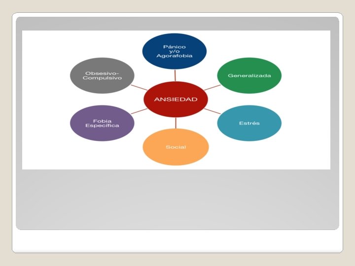 � La ansiedad generalizada es una preocupación excesiva e incontrolable. � La ansiedad social o la fobia social se caracteriza por un miedo a situaciones sociales o públicas � La claustrofobia es el miedo a los espacios cerrados � El trastorno de pánico ocurre cuando tienes ataques de pánico con frecuencia. � Las fobias específicas se caracterizan por un miedo intenso y permanente de objetos o situaciones concretas.
