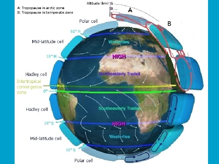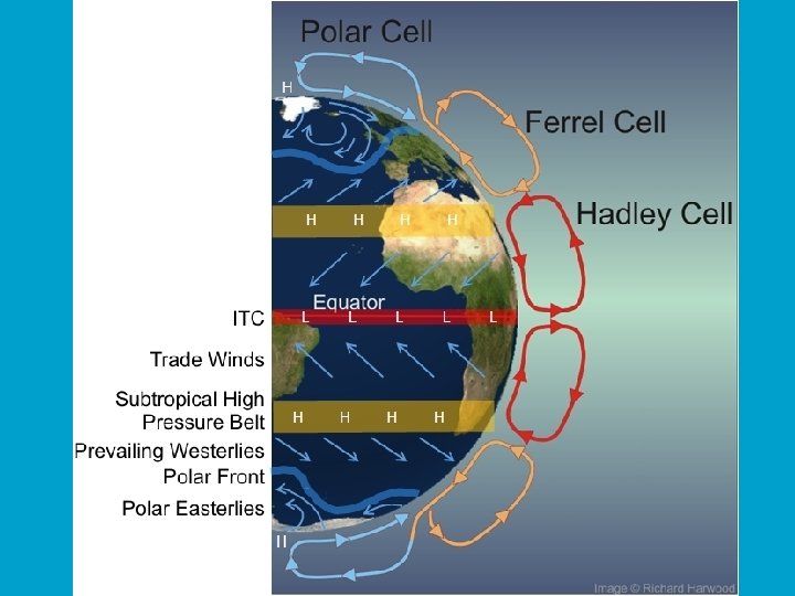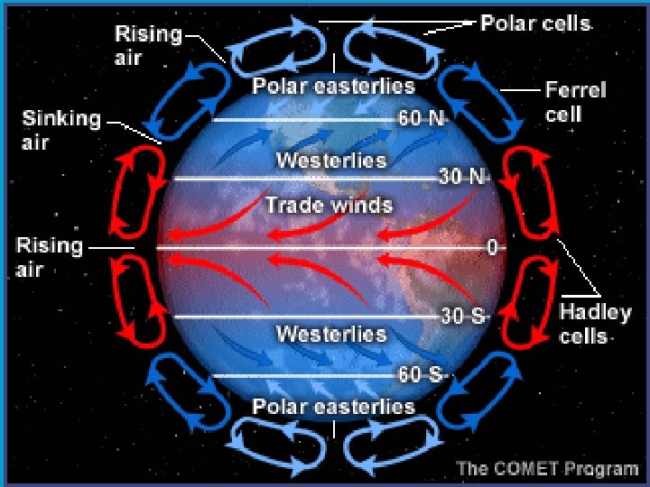 On a piece of paper • Draw a sphere • Draw lines for the equator, 30° N and S, 60 ° N and S • Discuss with the person next to you how to draw the 6 major bands of prevailing winds Hints: Remember that the Coriolis effect deflects to the right in the Northern hemisphere To draw the bands between 0 -30 °, remember that there is a LOW Pressure zone at the equator (due to Hadley cell) To draw the bands between 30 °-60 °, remember there is a high pressure zone at 30 °.
