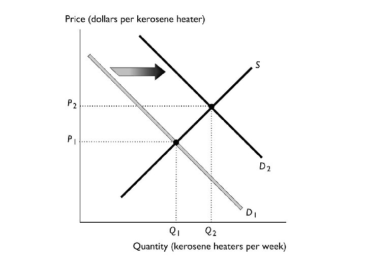 Free Response 1 • Last year a very severe ice storm hit the north counties of New York state, and the states of Vermont and Maine. Electric poles were down and no one had power for days. It was reported that the price of kerosene heaters skyrocketed and the number purchased increased during this time. Using a supply and demand diagram, show the impact of the ice storm on the market for kerosene heaters. •