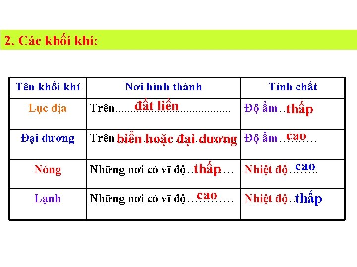 3. Các khối khí: - Tuỳ theo vị trí hình thành và bề mặt tiếp xúc, mà tầng không khí dưới thấp chia ra các khối khí nóng và lạnh, đại dương hay lục địa. Khối khí nóng, khối khí lạnh hình thành ở đâu? Nêu tính chất mỗi loại? Trong tầng dưới thấp của khí quyển được chia ra mấy khối khí, đó là những khối khí nào?