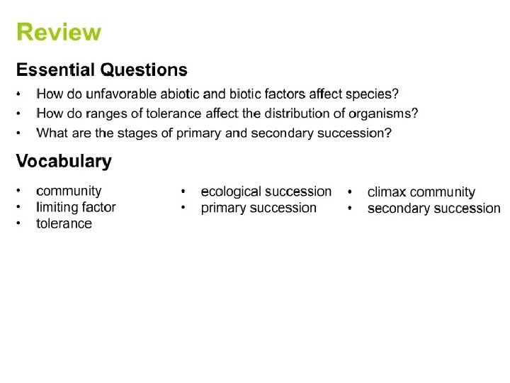 Ecological Succession �The change in an ecosystem that happens when one community replaces another as a result of changing abiotic and biotic factors is ecological succession. Two types: ▪ Primary succession ▪ Secondary succession