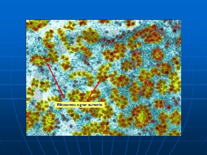 Los ribosomas son responsables del aspecto granuloso del citoplasma de las células. Es el orgánulo más abundante, varios millones por célula. Posee una subunidad mayor y otra menor, donde se encuentran los sitios P y A, lugar de “lectura” del ARNm y acoplamiento de los aminoácidos que formarán la proteína.