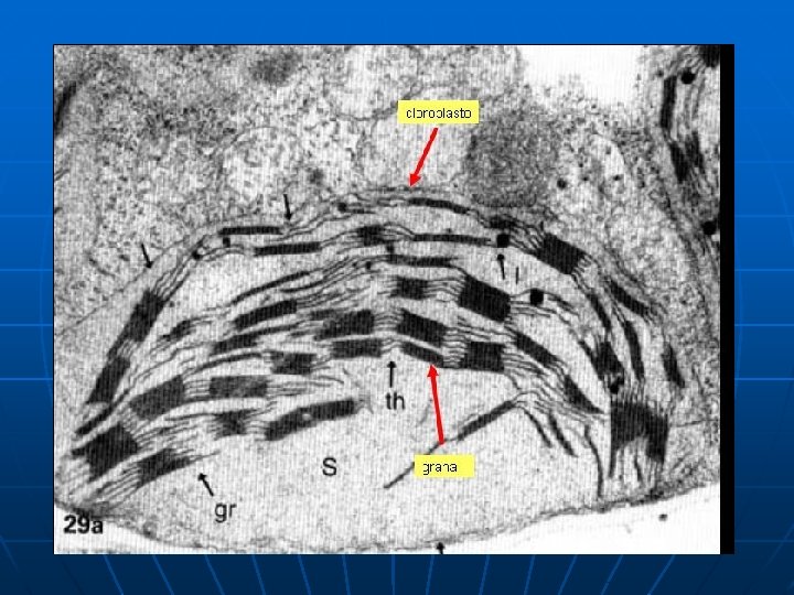 CLOROPLASTOS n n n Presentan una matríz –que contiene una molécula de ADN- y tilakoides, los que poseen los pigmentos de clorofila. El conjunto de tilakoides se denomina grana, y éstas se encuentran unidas a través de intergranas. En la matríz ocurre la fase oscura de la fotosíntesis y en el tilakoides la fase clara.