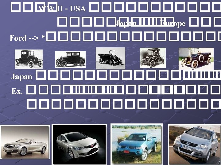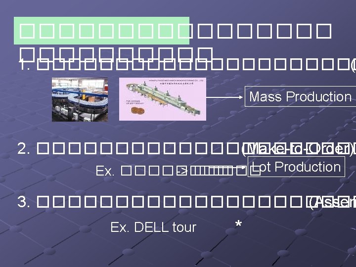 4. ������� (Lean production) Just In Time (JIT) Toyota Ex. Idea lean production : value steam Ex. Lean Manufacturing Example Toyota Plant Kentucky 5. ������� (Benchmarking) ==> ����� XEROX �� US => Japan ��������� ==> ������� Ex. Benchmarking Clip