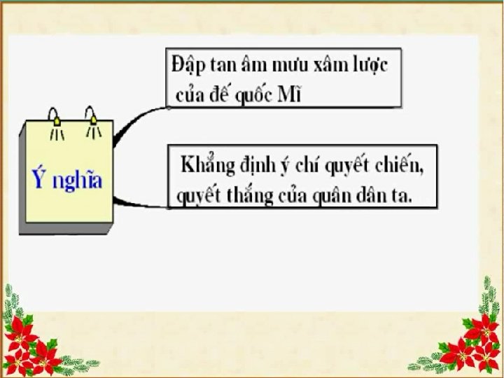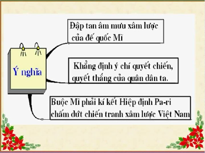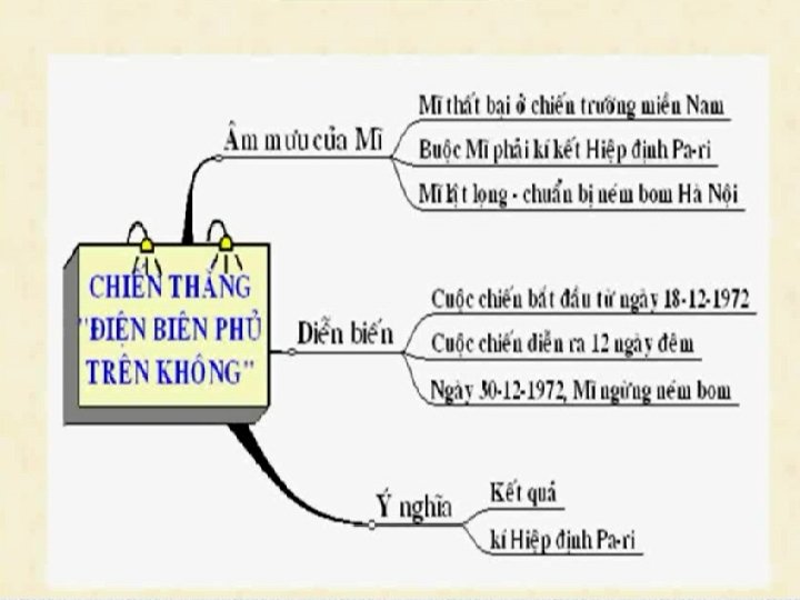 1. m mưu của Mĩ 2. Diễn biến: 3. Ý nghĩa: - Đập tan âm mưu xâm lược của đế quốc Mĩ. - Khẳng định ý chí quyết chiến, quyết thắng của quân dân ta. - Buộc Mĩ phải kí Hiệp định Pa-ri chấm dứt chiến tranh xâm lược Việt Nam. Trong 12 ngày đêm cuối năm 1972, đế quốc Mĩ dùng máy bay B 52 ném bom hòng hủy diệt Hà Nội và các thành phố lớn ở miền Bắc, âm mưu khuất phục nhân dân ta. Song, quân dân ta đã lập nên chiến thắng oanh liệt “ Điện Biên Phủ trên không”.