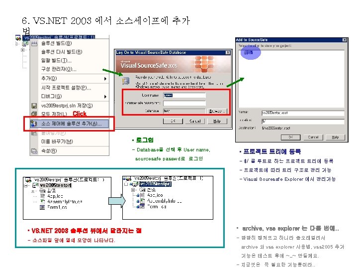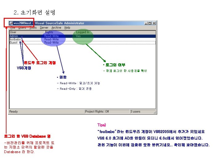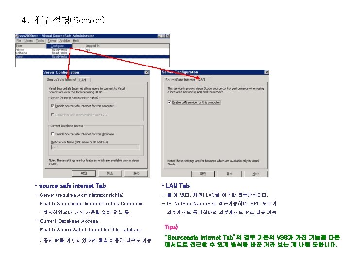 3. 메뉴 설명(Users) • 사용자 수정 - user name : id - readonly checkbox : 체크시 읽기만 가능. • 비밀번호 수정 • 사용자 추가 - old sourcesafe passwd - user name : id - new sourcesafe passwd - sourcesafe password : pwd - Verify - readonly checkbox • 사용자 삭제 - 또 만들면 되니 과감히 -. - : 체크시 읽기만 가능.