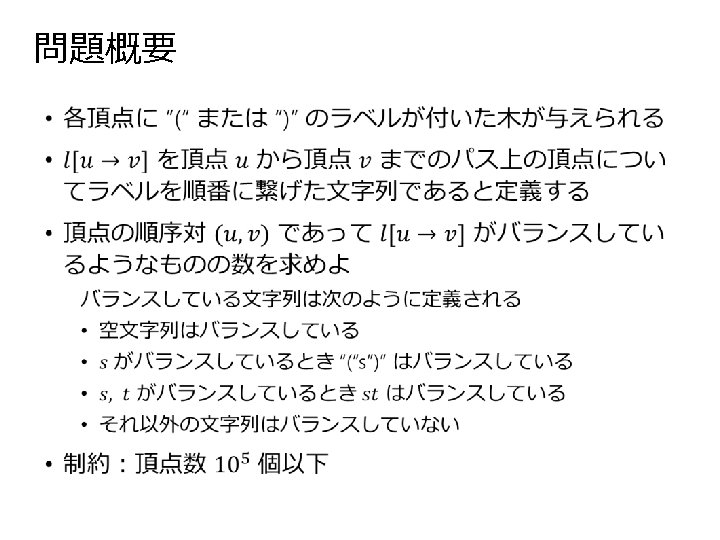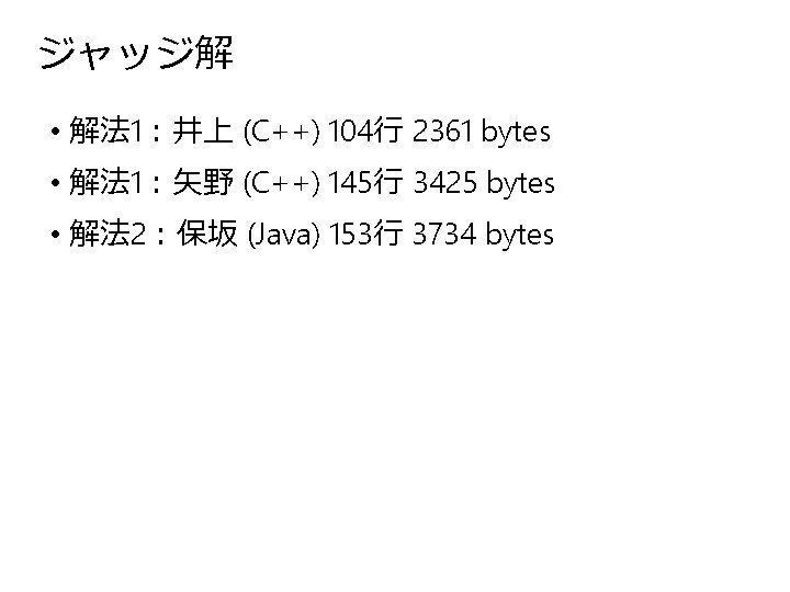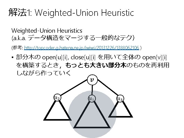 1 WeightedUnion Heuristic 1 WeightedUnion Heuristic 1 WeightedUnion Slides: 19 Download presentation 解法 1: Weighted-Union Heuristic • 解法 1: Weighted-Union Heuristic • 解法 1: Weighted-Union Heuristic • 解法 1: Weighted-Union Heuristic • 統計 • Accepted / Submissions 11 / 38 ( 29 %) • First Acceptance yutaka 1999 (34 : 18)
