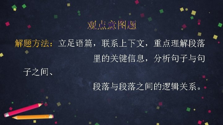 观点意图题的提问方式 1. What is the writer’s main purpose in writing this passage? 2. The writer mentions the three questions in Paragraph 2 to show that .
