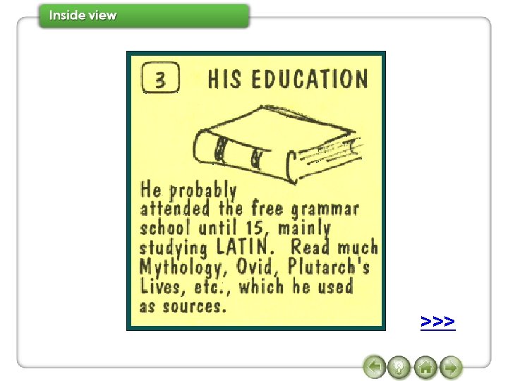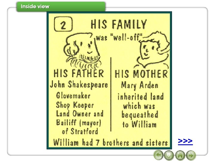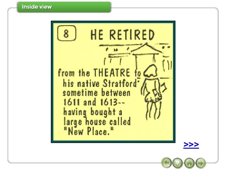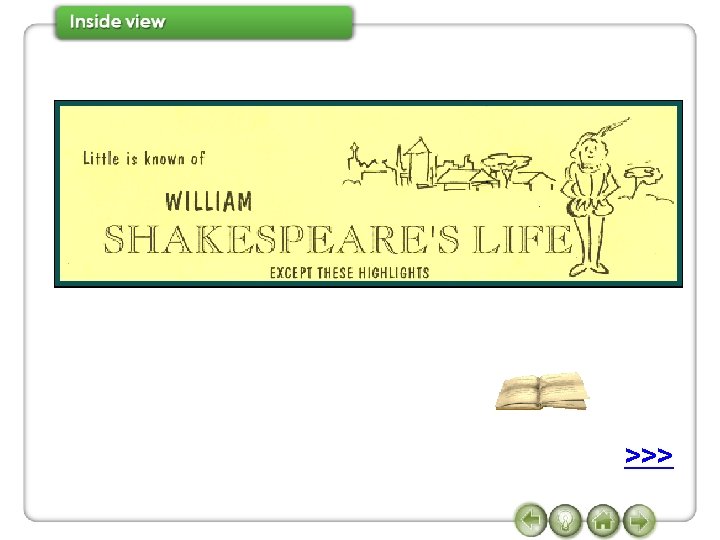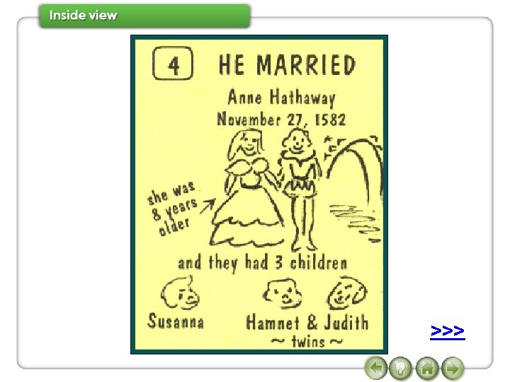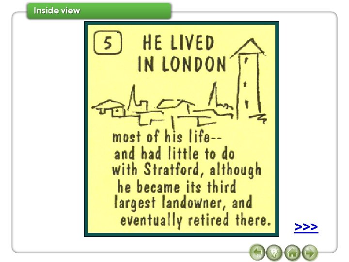 7 Watch Conversation 2 again and complete the sentences. when was Shakespeare born Janet So (1)_______________? Joe In 1564. when did he die Janet And (2) ______________? when did he come to London Joe In 1616. don’t know exactly Janet And (3) _______________? Joe We (4) ______________, but some time between 1585 and 1592. Janet And what did he do in London? >>> Joe He joined a group of actors, and wrote some of his most famous plays, such as,
