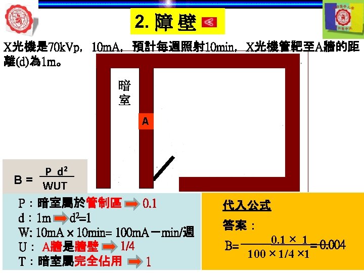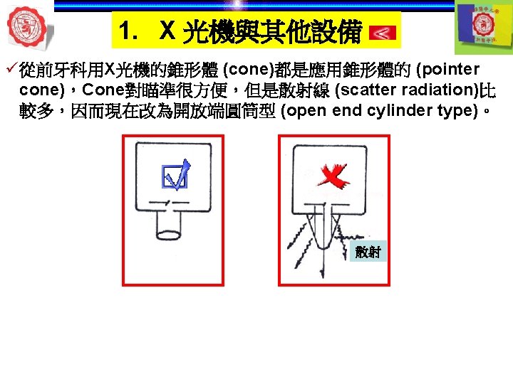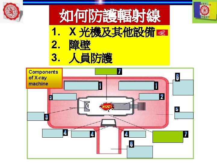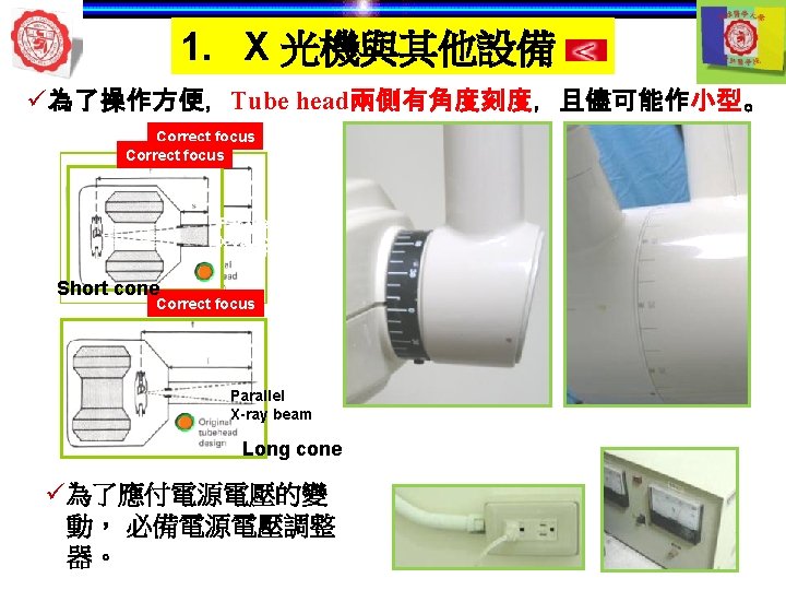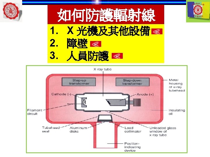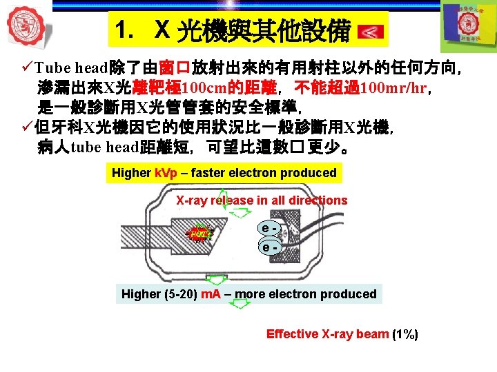 1. X 光機與其他設備 Aluminum filter Thickness of aluminium filter (absorb low level x-ray) =70 k. Vp -- at least 1. 5 cm Long & short wavelengths Short wavelengths >70 k. Vp -- more than 2. 5 cm Enlargement of detail Long wavelength Aluminum filter Collimator lead Short wavelength low energy Long wavelength Low frequency high energy Short wavelength High frequency