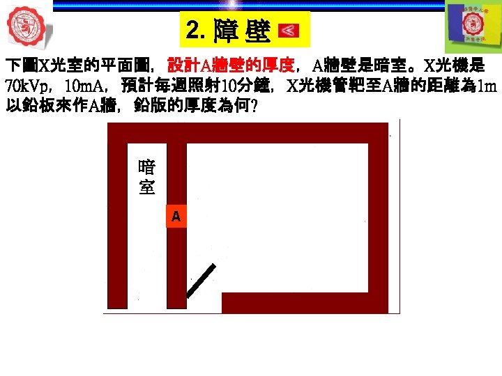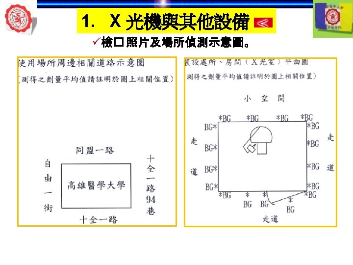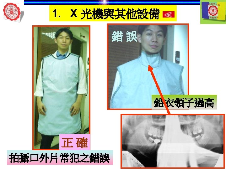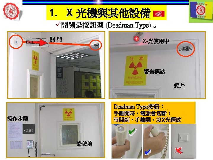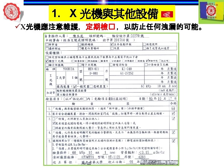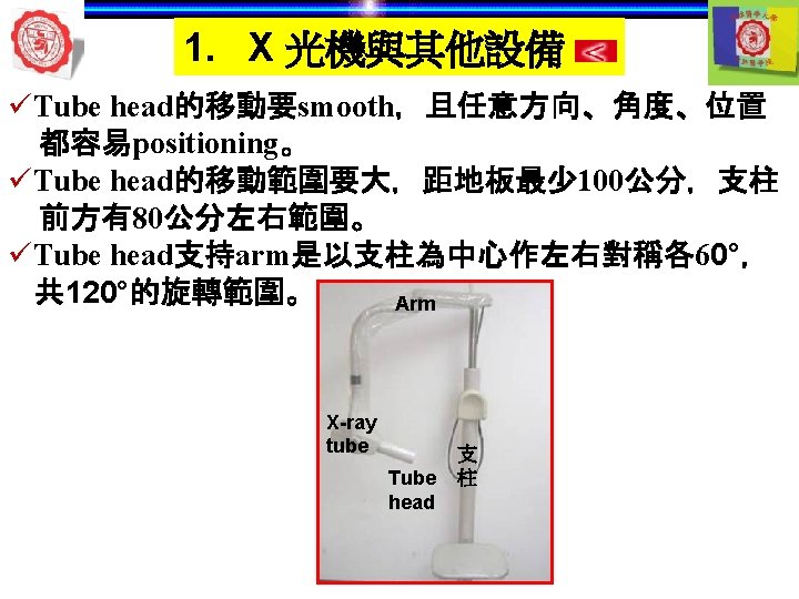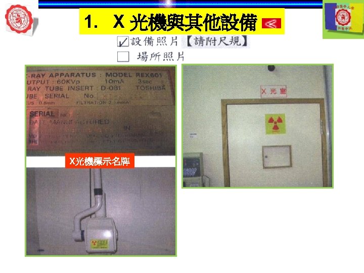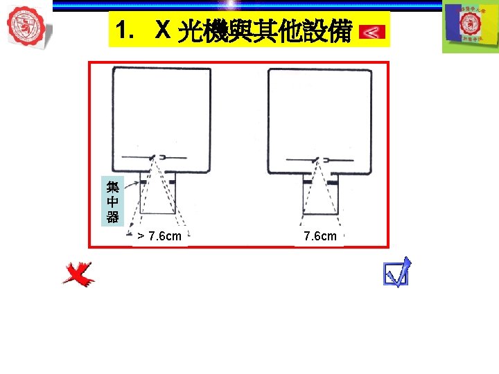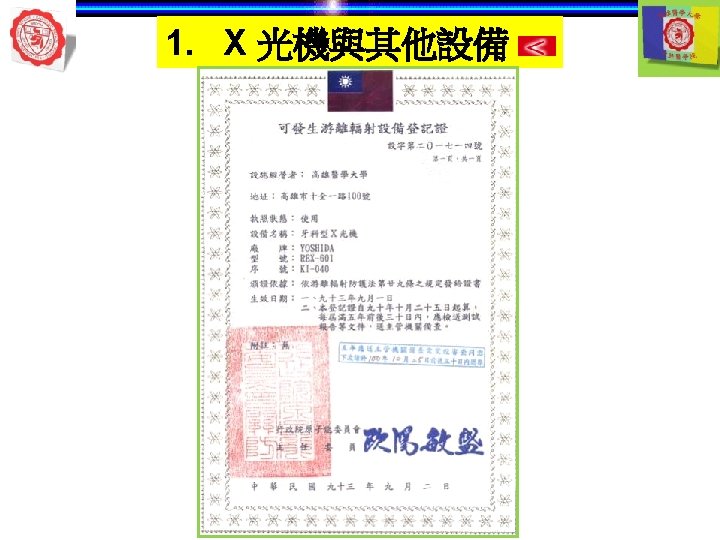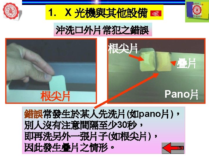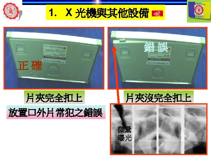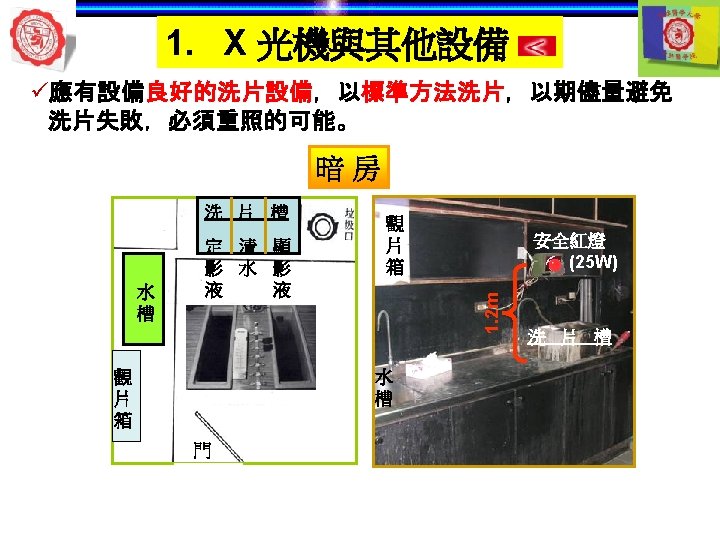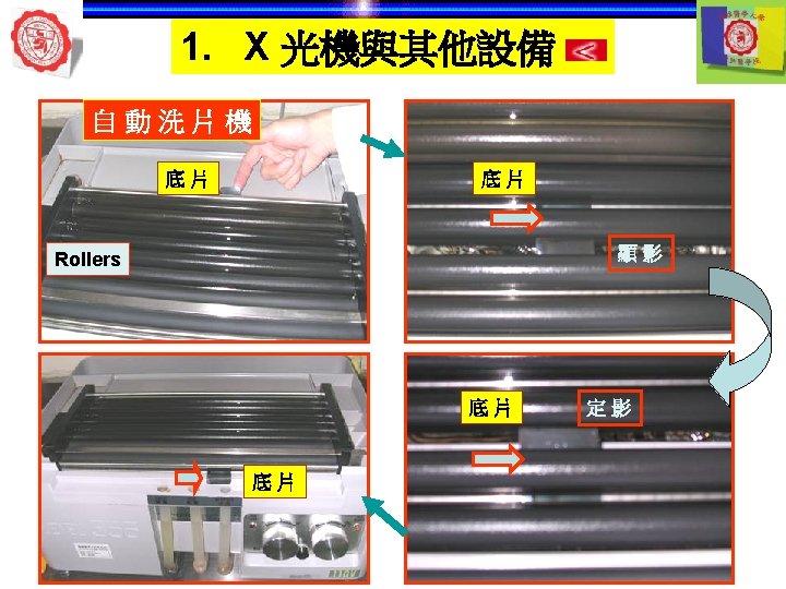 1. X 光機與其他設備 自動洗片機 顯影 清水 定影 5 min later 自動洗片機 溫度 Rollers 溫度越高— 洗片時間越短 Roller film transporter Developer component Power Drive Off 開關 Fixer component Film lead slot Water component Drying chamber Film slot Processor housing Replenisher pump Replenisher solution