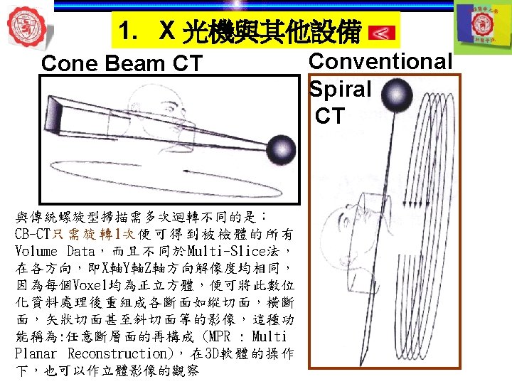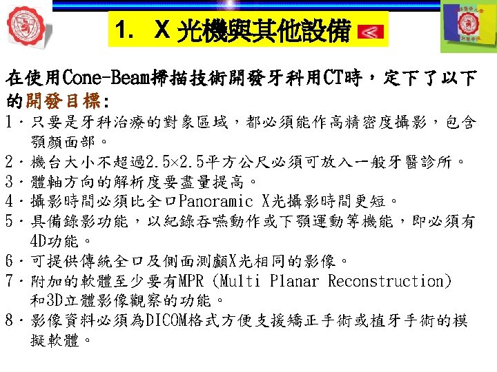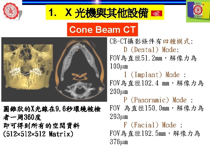 1. X 光機與其他設備 ü使用牙科X-ray數位化,以降低radiation dose (up to 80%)。 Image detectors (Digital) Direct Indirect Intraoral Laser scanner Extraoral
