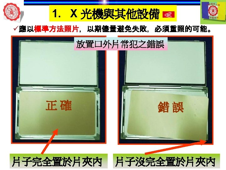 1. X 光機與其他設備 ü牙科口外片使用增感屏,以期用最少的X光照射。 Panoramic Cassette Front Intensifying Screen Back Cephalometric Cassette Back Intensifying Screen Front Panoramic Front Extraoral film Front Intensifying Screen Back Intensifying Unexposed Screen film Indirect-action, screen film Calcium tungsate screen 螢光 Photoelastic effect UV Rare earth screen