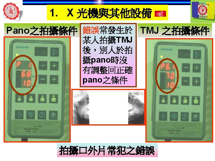 1. X 光機與其他設備 ü計時器timer:最好要能精確到 1/20秒, 最長不應超過5秒。 固定 k. VP 調整 時間 k. V m. A Control Panel Upper Lower molar anterior Upper premolar Lower premolar Upper molar Lower anterior Control Panel