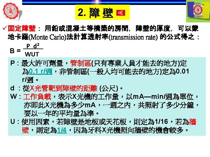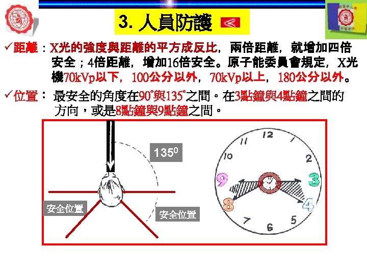 3. 人員防護 ü安全規定: 安全標準。 Current Guidelines International Commission on Radiological Protection (ICRP, Pub 26) 1. No practice unless a positive net benefit 2. As low as reasonably achievable (ALARA) 3. Not exceed recommended dose limits 1. Patients 2. Radiation workers 3. General public