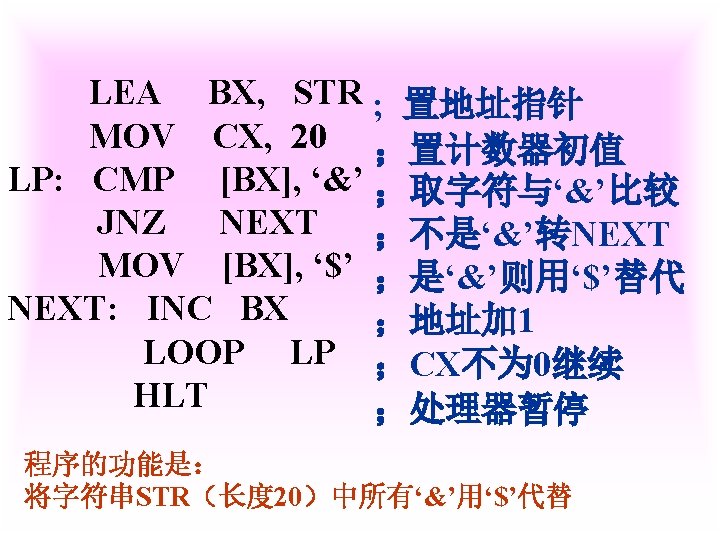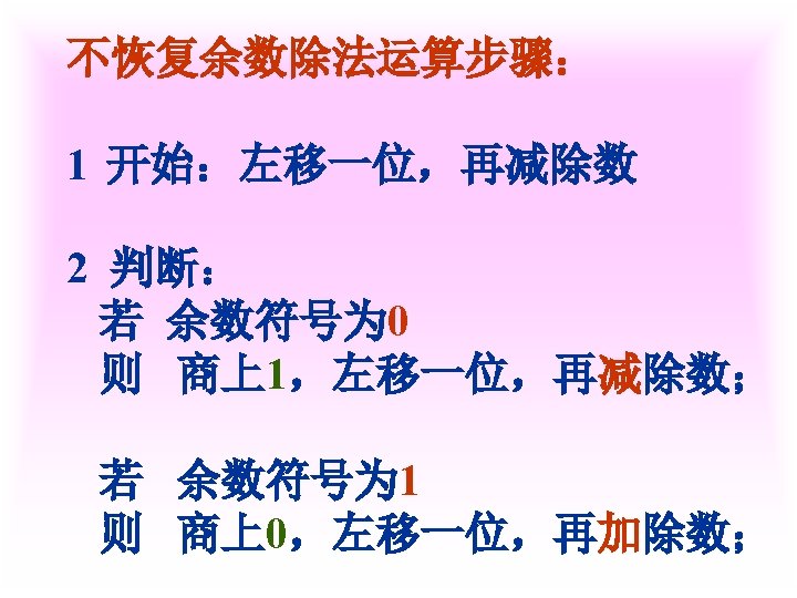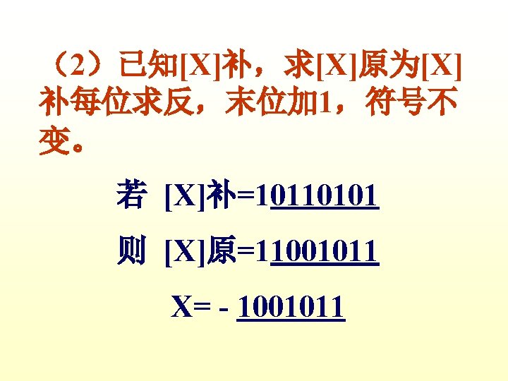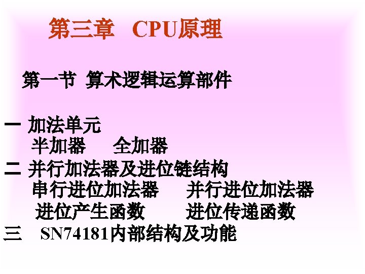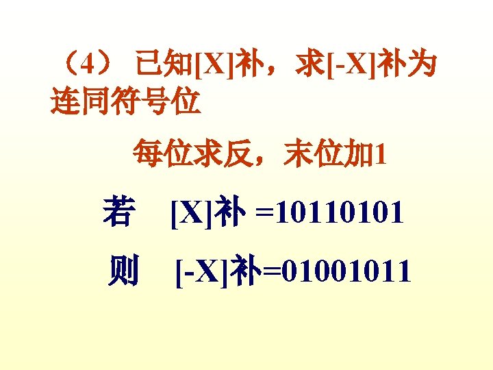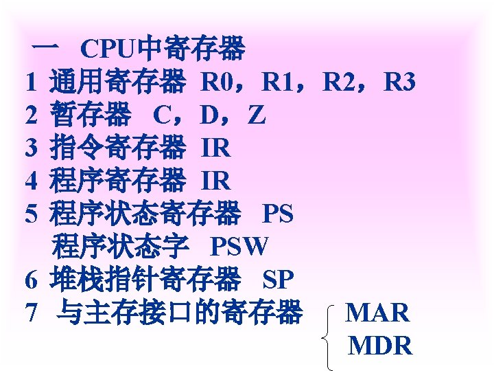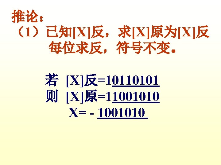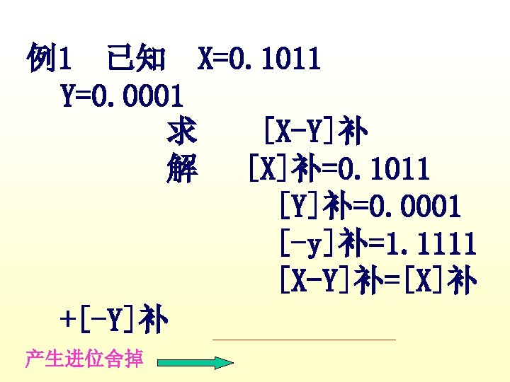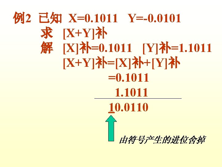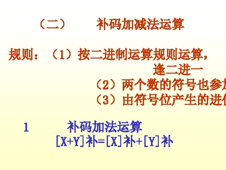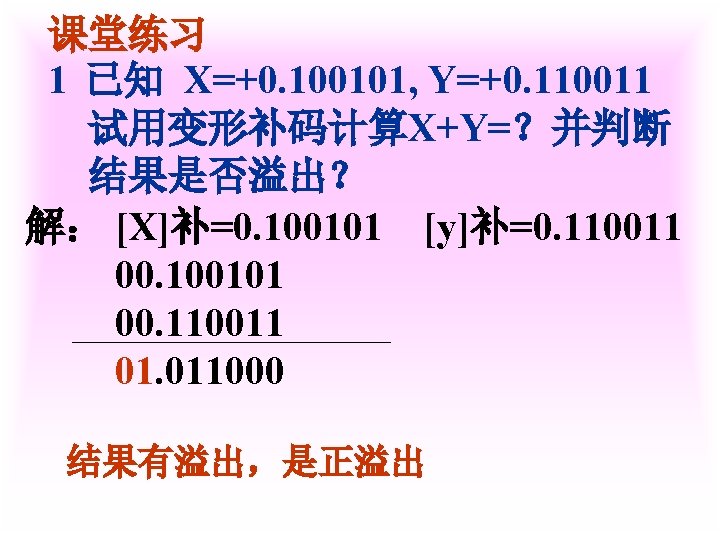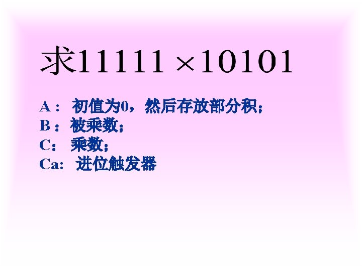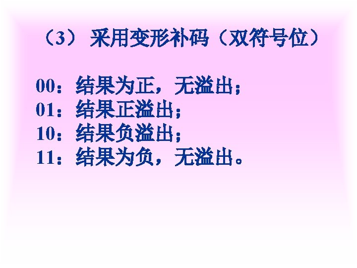 1 X0 1011 Y0 0001 XY X0 1011 Slides: 42 Download presentation 例1 已知 X=0. 1011 Y=0. 0001 求 [X+Y]补 解 [X]补=0. 1011 [Y]补=0. 0001 [X+Y]补=[X]补+[Y]补 =0. 1011 0. 0001 0. 1100 例3 已知 X=-0. 1001 Y=-0. 0101 求 [X+Y]补 解 [X]补=1. 0111 [Y]补=1. 1011 [X+Y]补=[X]补+[Y]补 =1. 0111 1. 1011 11. 0010 例2 已知 X=0. 1011 求 [X-Y]补 解 [X]补=0. 1011 Y=-0. 0101 [Y]补=1. 1011 [-Y]补=0. 0101 [X-Y]补=[X]补+[-Y]补 =0. 1011 0. 0101 1. 0000 例3 已知 X=-0. 1001 Y=-0. 0101 求 [X-Y]补 解: [X]补=1. 0111 [Y]补=1. 1011 [-Y]补=0. 0101 [X-Y]补=[X]补+[-Y]补 =1. 0111 0. 0101 1. 1100 2 已知 X=-0101001 Y=+1100101 试以 8位二进制数的形式利用变形 补码计算X-Y=?,并判断溢出。 解: [X]补=11010111 [Y]补 = 01100101 [-Y]=10011011 111010111 11001101110010 结果为负溢出 3 已知 用变形补码计算[X-Y]补=? 并判断溢出 解:X= - 0. 0100010 [X]补=1. 1011110 Y= - 0. 0010011 [Y]补=1. 1101101 [ - Y ]=0. 0010011 [X-Y]补=[X]补+[-Y]补 =11. 1011110 00. 0010011 11. 1110001 无溢出 Ca 0 +B 0 0 +0 0 0 +B 1 0 +0 0 A 00000 11111 01111 00000 01111 00111 11111 00110 10011 00000 10011 C 10101 11010 11101 01110 Ca 0 +B 1 0 A 01001 11111 01000 10100 C 10111 01011 112— 12 (1) MOV FT 0 FT 1 PC M R 0, R 2 MAR MDR IR ST 0 R 2 C ET 0 ET 1 C MDR M PC+1 PC 2 MOV R 1, (PC)+ ET 0 PC ET 1 M MAR MDR IR ST 0 ST 1 ST 2 ST 3 ET 0 ET 1 PC MAR M MDR C PC+1 Z Z PC PC MAR M MDR IR PC+1 PC PC 3 MOV ST 0 ST 1 ST 2 DT 0 DT 1 -(SP) , -(R 1) R 1 -1 Z MAR, R 1 MDR C SP-1 Z Z MAR, SP 4 MOV (R 0)+, X(R 3) ST 0 PC MAR ST 1 M MDR D PC+1 ST 2 D+R 3 Z ST 3 Z MAR ST 4 M MDR C DT 0 DT 1 DT 2 R 0 MAR R 0+1 Z Z R 0 PC 5 MOV ST 0 ST 1 ST 2 ST 3 DT 0 (R 0), (PC)+ PC MAR M MDR PC+1 Z Z MAR R 1 MAR C 6 MOV DI, (SP)+ ST 0 ST 1 ST 2 ST 3 SP MAR M MDR SP+1 Z Z SP DT 0 DT 1 PC MAR M MDR MAR PC+1 PC C 31 -----12 X Y DB DB MOV ADD SUB HLT 0 CH 06 H AL, X AX, Y AX, 5