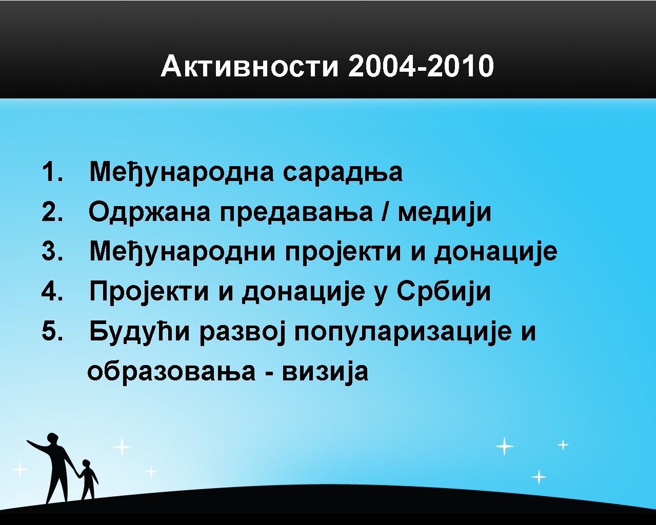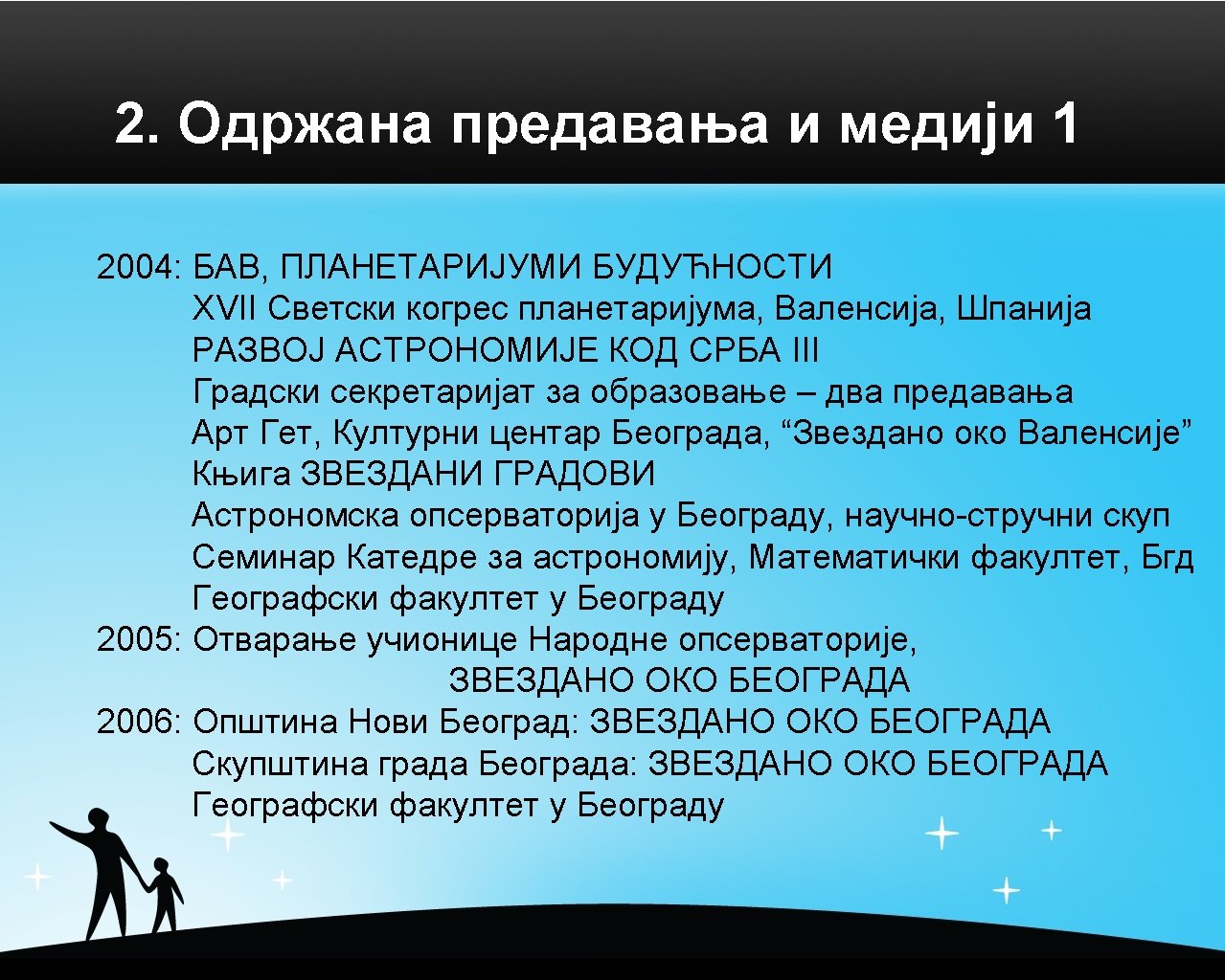 1. Међународна сарадња XVII IPS (International Planetarium Society) Conference Valencia, Spain, July 2004 V INSAP (INSpiration by Astronomical Pehnomena) Conference Chicago, USA, Jun/July 2005 CAP (Communicating Astronomy with the Public) Conference, Athens, Greece, October 2007. STUDING NATURE TROUGH CENTURIES Conference Belgrade, Serbia, October 2007. MEARIM (Middle East Africa Regional International Meeting) Cairo, Egypt, April 2008. VI SBGAC (Serbian-Bulgarian Astronomy Conference) Belgrade, Serbia, May 2008. Show Physics (Euro Physics Fun Conference) Geneva, Switzerland, April 2009.