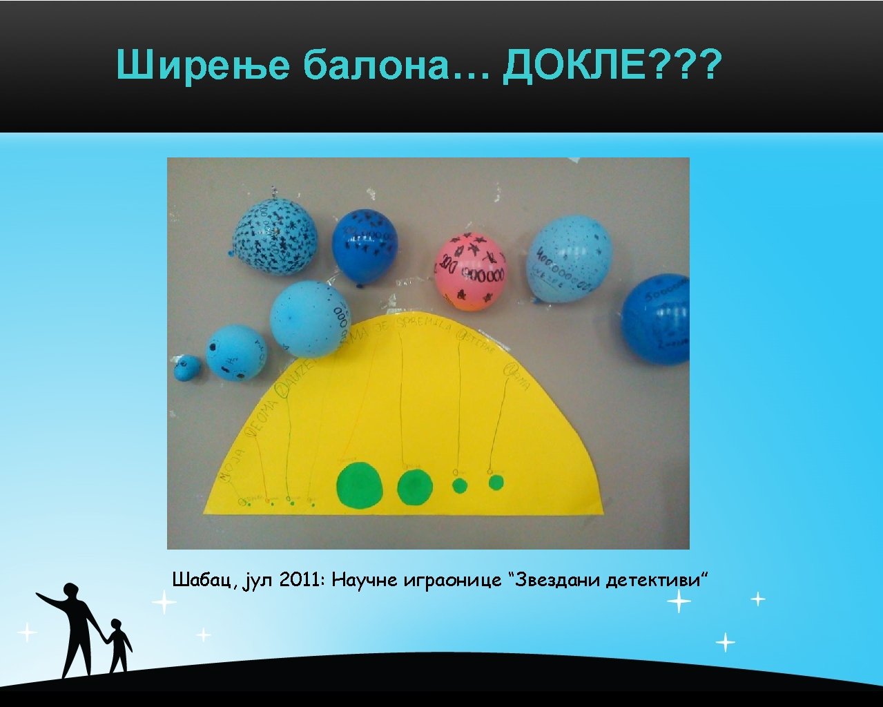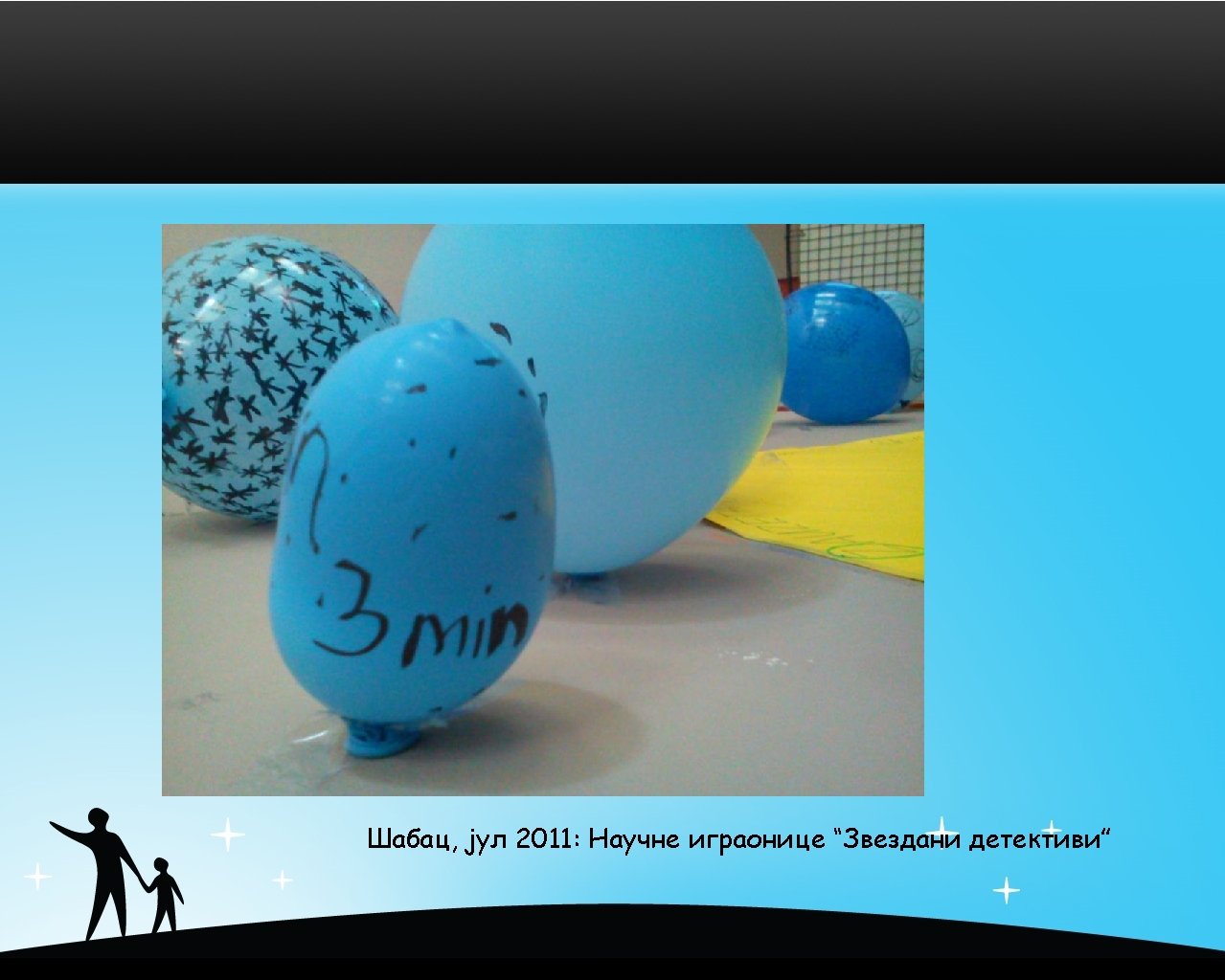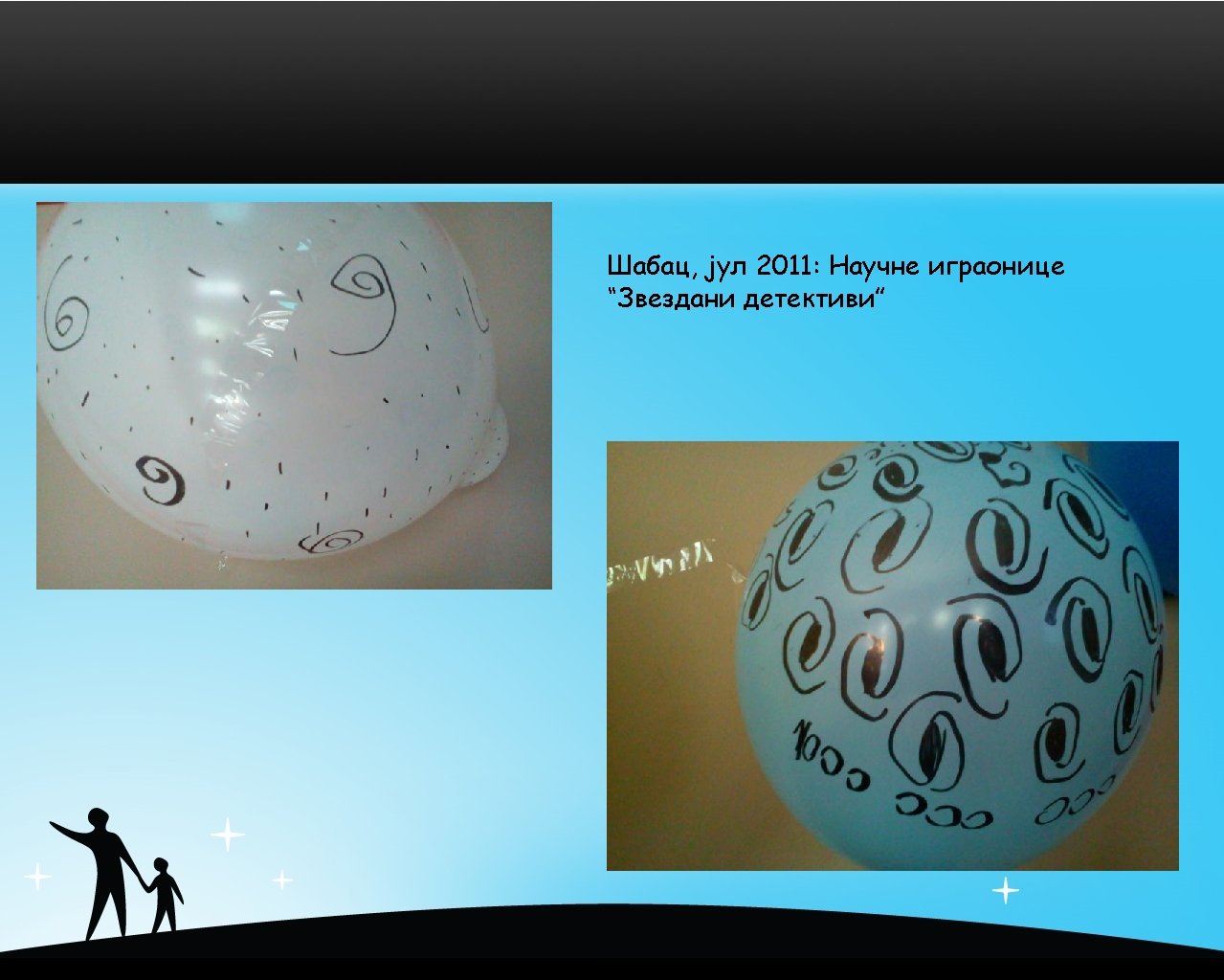 Мобилни планетаријум / могуће пратеће активности • Art competition (painting & writing) for kids “Universe – Yours to Discover” (September 2008 - April 2010) collected nearly 1000 artworks. It is going to become a traditional ASTRONOMY/INSPIRATION/ART (AIA) competition for kids (5 to 15 years) in the future. Next AIA competition, “Star detectives”, will open in September 2010. • Astronomy performance for kids “Balloon, glass of water and a cell phone”, first performed at Show Physics (Apr 2009), use three simple things to explain the Big Bang theory, expansion, content and size of the Universe. It has been shown to 1100 children (18 shows) in 2009 -2010. This show is easygoing and fun so it will continue in 2010 in cooperation with schools and preschools. • Astronomy book for kids: “Pirouette and Milky Way” (2008 -2012) describes the Universe trough the mother-daughter conversation started with ballet costume talk. Book should be (finally) published in 2012.