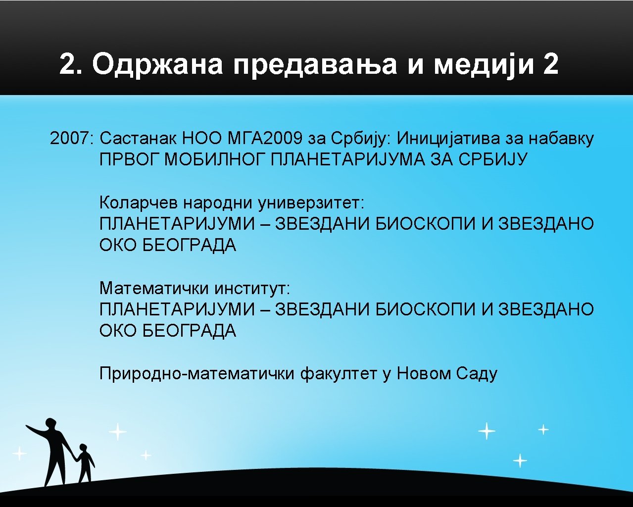 7. Будући развој популаризације и образовања - визија Society of Astronomers of Serbia National Astronomical Committee FN, noć istraživača • Faculty of Geography (Belgrade University) • Faculty of Physics (University of Novi Sad) schools Explanation: Projects preschools Ministry of Science Belgrade City Government GTTP Institute for the Advancement of Education Publishers, 2004, 2005. . . ? - Excelent program cooperation or approved money support - Project (4000 EUR) submitted for 2010, waiting for approval - No official support for suggested UNAWE project “Coordination & Education Team (CET) for planning, organizing and realization of mobile planetarium visits in 2010” and GTTP activities - Expecting official accreditation for 2 seminars for teachers education