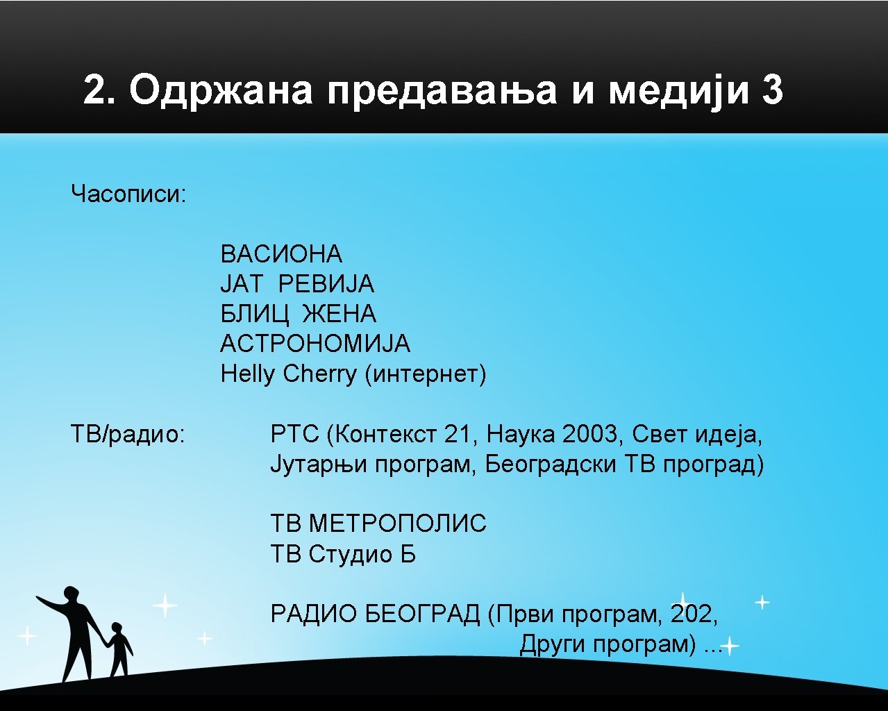 *** Acknowledgements *** - people: • Milica Zivadinovic – painter, Serbian Cultural Center, Paris • Aleksandar Zorkic – science communicator, “Astronomy Magazine”, Novi Sad • Sasa Golubovic – master in economy, Friends of Children, Barajevo • Natalija Stevanovic – archeologist, Public Library, Barajevo • Maja Ljubicic – preschool teacher, Belgrade • Milan Jevtovic – professor of physics, primary school “Josif Kostic”, Leskovac • Jelena Sopic – BSc in Pedagogy, preschool teacher, Preschool “Loptica”, Belgrade • dr Aleksandar Petrovic – Faculty of Geography, University of Belgrade • Branka Petrovic – school teacher, primary school “Banovic Strahinja”, Belgrade
