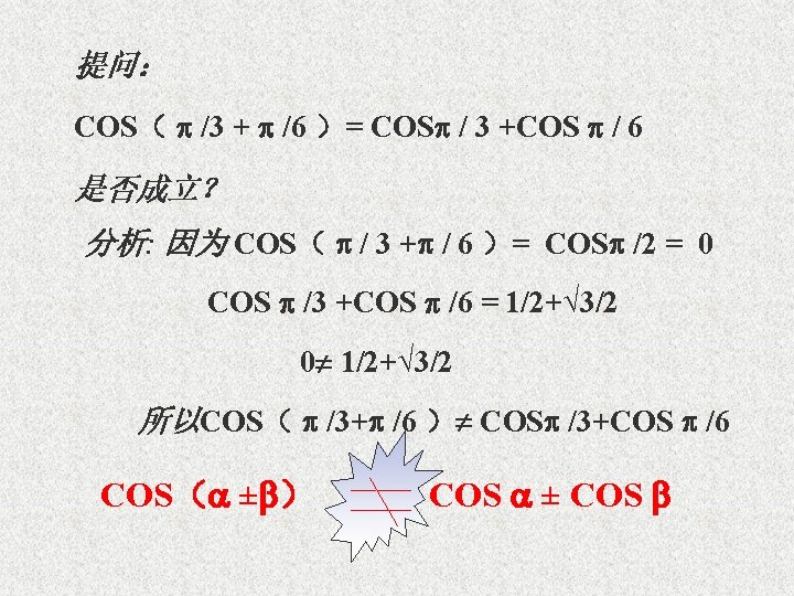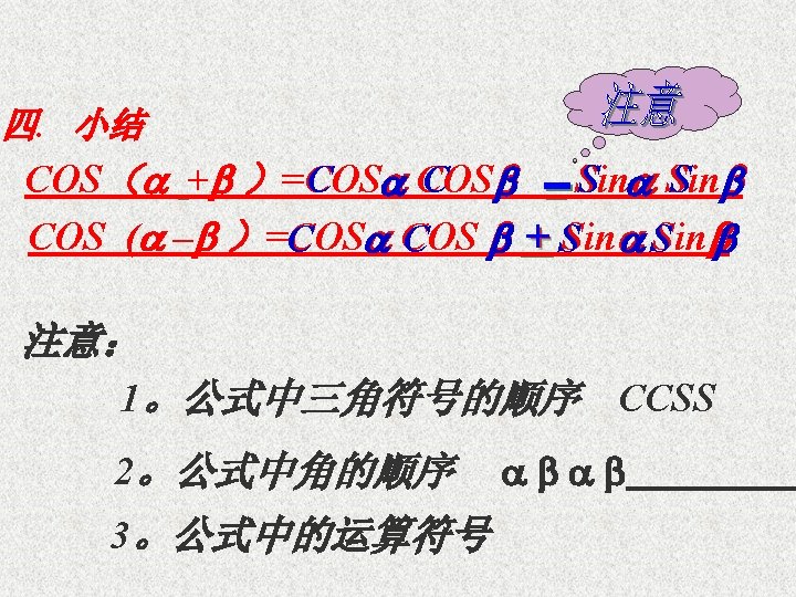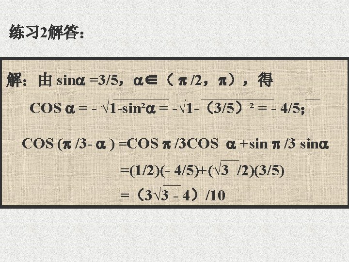 C ± =C C S S 三. 练习 1. 不查表, 求COS 75°的值. 2. cos 72°cos 12°+sin 72°sin 12° 2. cos 72 sin 34°sin 26°-cos 34°cos 26° cos 70°cos 10°+sin 110°cos 80° cos 70 3. 已知sin = 3/5, ∈( / 2, ), 求COS( /3 - )的值.