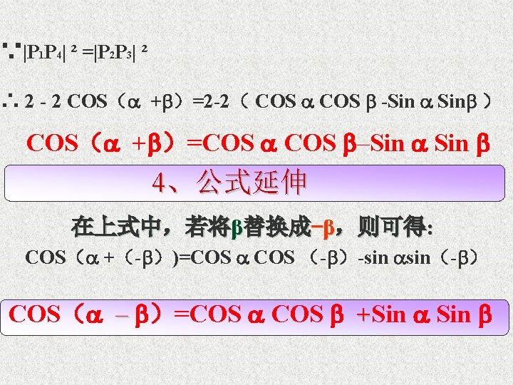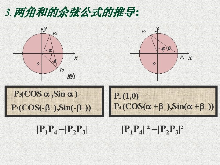 如图 1中 y P 2(COS , Sin ) P 3(COS(- ), Sin(- )) P 2 O P 1 - x P 3 图 1 |P 2 P 3 |² =[COS -COS(- )] ² +[Sin -Sin(- )] ² =[COS -COS ] ² +[Sin +Sin ] ² = COS² +COS² -2 COS + Sin² + 2 Sin =2 -2(COS -Sin )