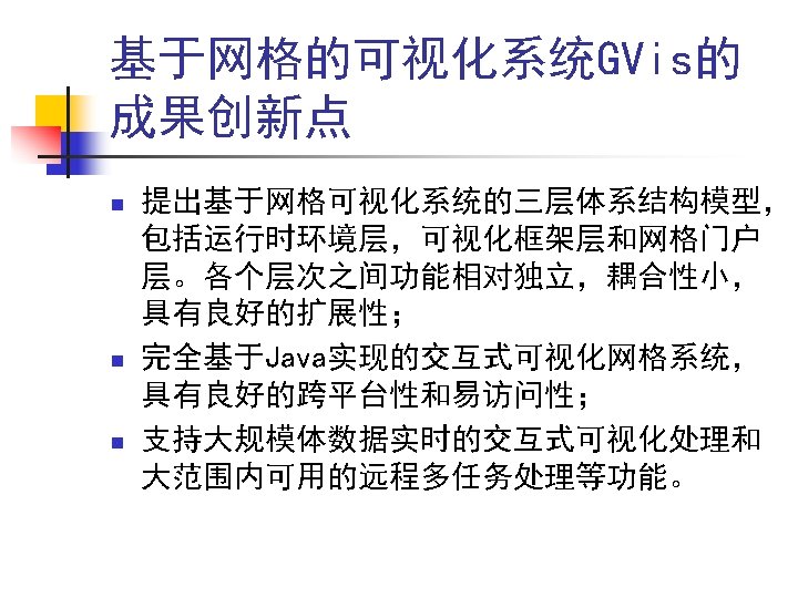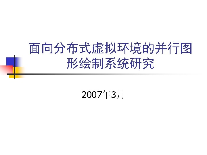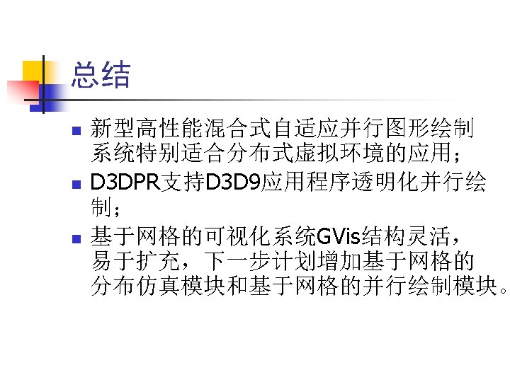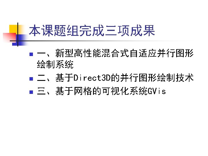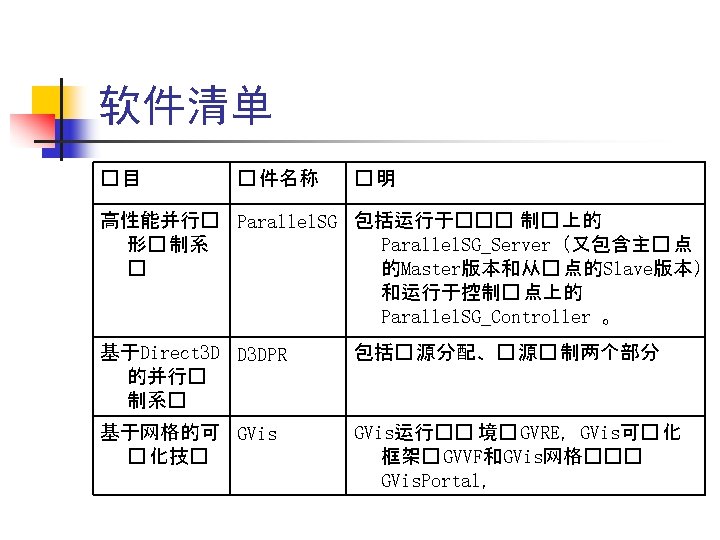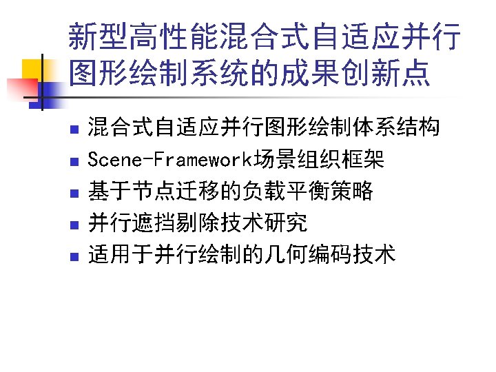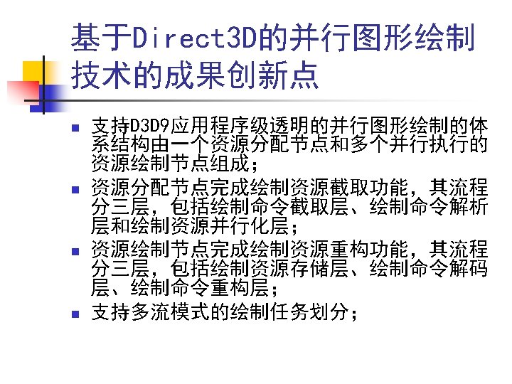 论文清单(续 1) 7. ZONGHUI WANG, XIAOHONG JIANG , JIAOYING SHI,Efficient communication approach in HLA-based Distributed simulation for VR application,Journal of Computational Information Systems , 20060401,SCI 8. Aihong Qin,Hua Xiong , Jiaoying Shi, Zhen Liu,Piecewise Compression of Large Mesh,IS&T/SPIE’s 16 th Annual Symposium Electronic Imaging Science and Technology 2006,20060601,SCI 9. QIN Ai-hong, XIONG Hua, PENG Hao-yu, LIU Zhen, SHI Jiao-ying, Cluster Parallel rendering based on encoded mesh ,Jounal of Zhejiang Univesity,7,20060701,SCI 10. Haoyu Peng, Hua Xiong, Jiaoying Shi,Parallel-SG:Research of Parallel Graphics Rendering System on Cluster,Proceedings of the 2006 ACM International Conference on VRCIA,20060714,EI 11. Hua Xiong,Haoyu Peng,Aihong Qin. Jiaoying Shi,Parallel Occlusion Culling on GPUs Cluster,Proceedings of the 2006 ACM International Conference on VRCIA,20060714,EI