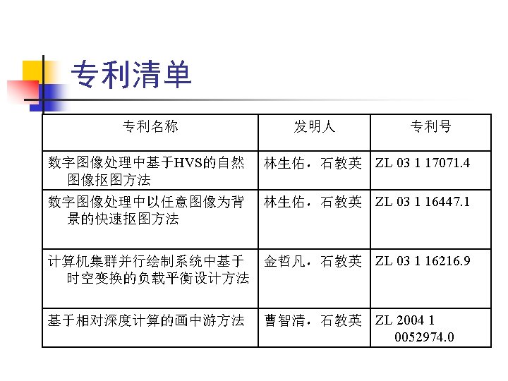 论文清单 1. Zonghui Wang, Xiaohong Jiang, Jiaoying Shi,HLA/RTI Performance Testing,20051006,国际学术会议论文集,EI 2. 仇应俊, 石教英, 赵友兵, 陈为,面向网格的交互式可视化平台GVis 研究与实现,计算机研究与发展,20051201,国内一级刊物论文 3. 石教英, 赵友兵, 仇应俊,面向网格的可视化系统研究,计算机研究 与发展,41(12),20051201,EI 4. 毛祖秋, 李超, 林海, 石教英, 林叶青,基于Open. SG的多屏幕立体绘 制—用于模型的集群立体显示系统,计算机研究与发展,42, 20051201,国内一级刊物论文 5. Zonghui Wang, Jiaoying Shi, Xiaohong Jiang,A Scalable HLAbased Distributed Simulation Framework for VR Application, 16 th International Conference on Artificial Reality and Telexistence 2006,20060101,SCI 6. Yaping Zhang, Yang Zhao, Jiaoying Shi, Dan Xu,Digitization of culture heritage based on tour into the picture, TECHNOLOGIES FOR E-LEARNING AND DIGITAL ENTERTAINMENT 2006, 20060401, SCI