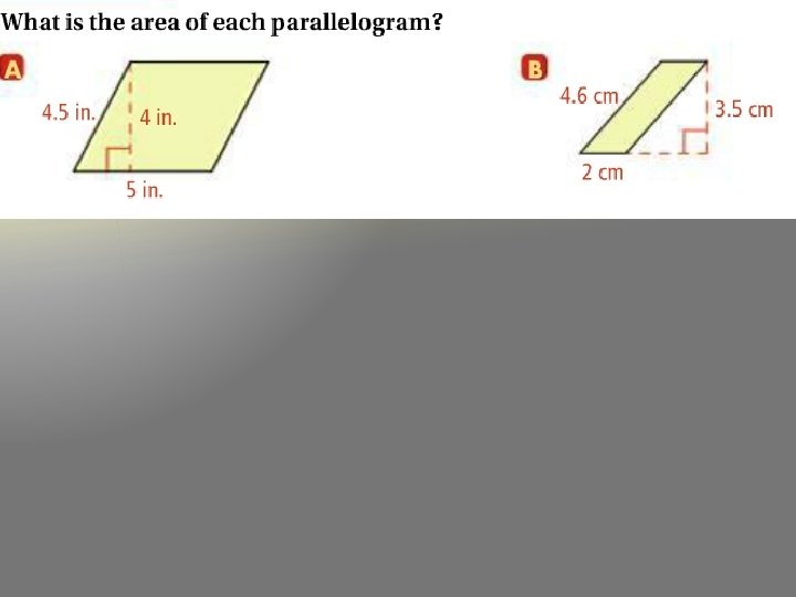 Theorem � The area of a parallelogram equals the product of a base and the height to that base. (A=bh) 12 5