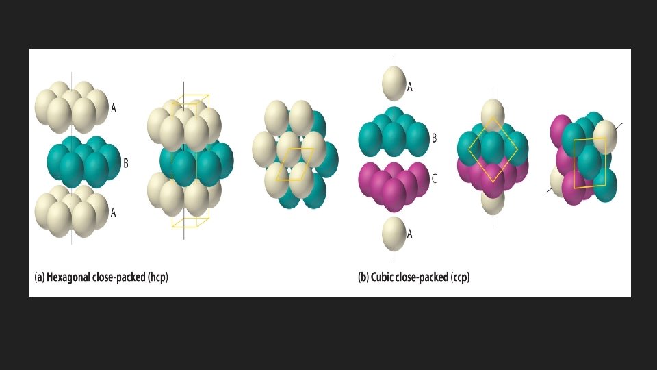 Cubic Closest Packed Structure (abc, abc) arrangement of particles in the structure Has a face centered cubic unit cell Referred to as a cubic closest packed structure (ccp) The spheres in every 4 th layer occupy the same vertical position hence (abc, abc) arrangement