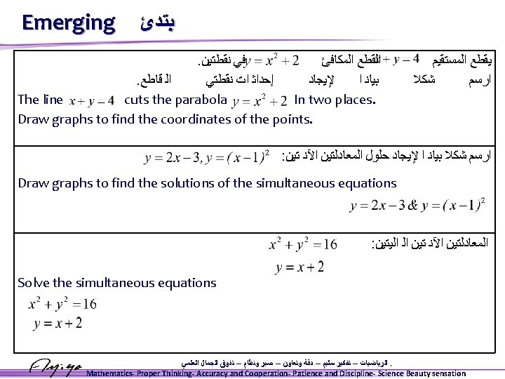 Simultaneous linear and quadratic equations Solution: Rearrange (2): Eliminate y: Substitute in (2 a): The points of intersection are ﺍﻟﺮﻳﺎﺿﻴﺎﺕ – ﺗﻔﻜﻴﺮ ﺳﻠﻴﻢ – ﺩﻗﺔ ﻭﺗﻌﺎﻭﻥ – ﺻﺒﺮ ﻭﻧﻈﺎﻡ – ﺗﺬﻭﻕ ﺍﻟﺠﻤﺎﻝ ﺍﻟﻌﻠﻤﻲ. Mathematics- Proper Thinking- Accuracy and Cooperation- Patience and Discipline- Science Beauty sensation