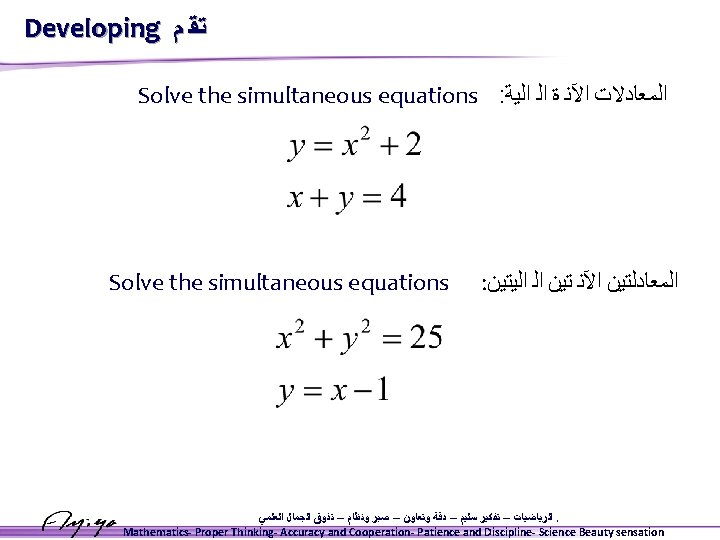 Elimination We could also have solved this system of equations using the elimination method. Solve: Subtract equation 1 from equation 2 : y = x 2 + 1 y=x+3 1 2 0 = x 2 – x – 2 This is the same single quadratic equation as the one we found using the substitution method. ﺍﻟﺮﻳﺎﺿﻴﺎﺕ – ﺗﻔﻜﻴﺮ ﺳﻠﻴﻢ – ﺩﻗﺔ ﻭﺗﻌﺎﻭﻥ – ﺻﺒﺮ ﻭﻧﻈﺎﻡ – ﺗﺬﻭﻕ ﺍﻟﺠﻤﺎﻝ ﺍﻟﻌﻠﻤﻲ. Mathematics- Proper Thinking- Accuracy and Cooperation- Patience and Discipline- Science Beauty sensation