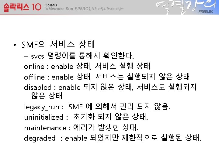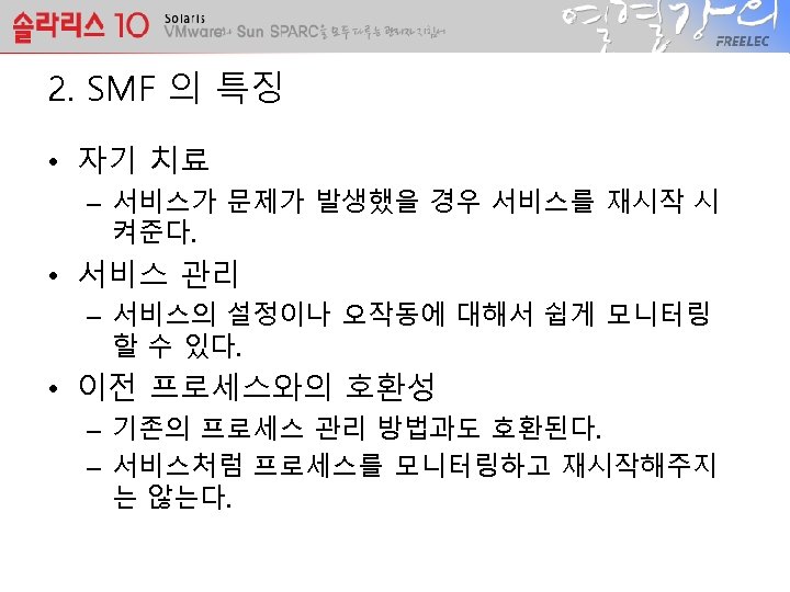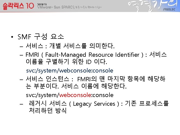 1. SMF의 개념 • 솔라리스에서 프로세스를 관리하는 방식이 프로 세스 관리 방식에서 서비스(Service)관리 방식으 로 전환됐다. • SMF는 프로세스에 대해 그에 해당하는 ID(FMRI) 를 만들어 관리하고 있다. # svcs -a STATE legacy_run disabled online STIME 7: 56: 47 7: 56: 28 FMRI lrc: /etc/rc. S_d/S 50 sk 98 sol svc: /system/metainit: default svc: /network/pfil: default