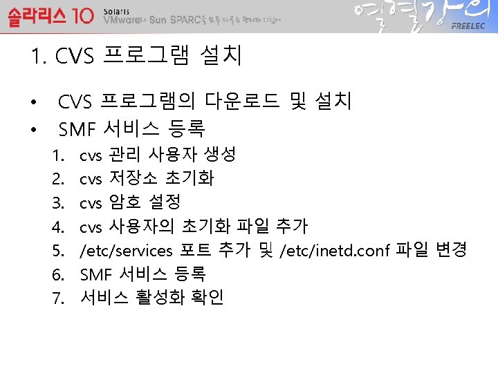 솔라리스 10 Chapter 09 솔라리스 서비스 관리(SMF) Solaris 1. SMF(Service Management Facility)개념 Solaris 2. SMF의 구성 요소 Solaris 3. CVS 프로그램의 SMF 서비스 등록