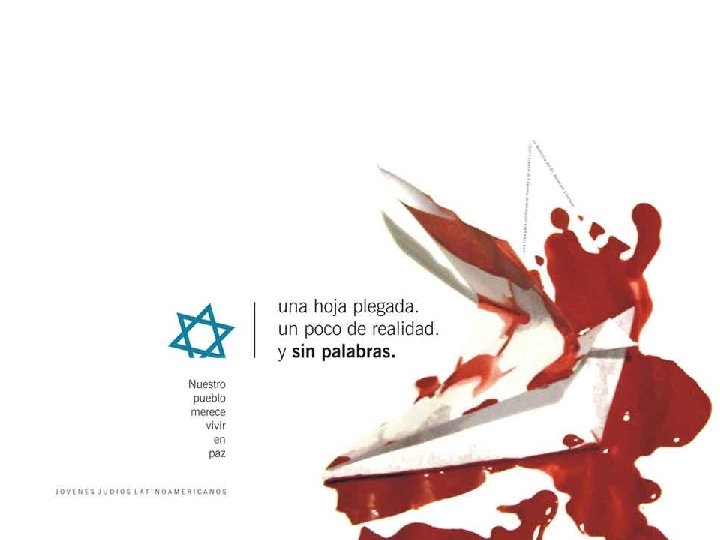 Concurso de Hasbará Hace poco más de cien años, a la salida del primer Congreso Sionista en Basilea, Suiza, Theodor Hertzl afirmó: “Si lo queréis, no será un sueño”. Cincuenta años después David Ben Gurión leía la Declaración de Independencia de Israel. Hoy, una importante cantidad de medios de comunicación, intelectuales, escritores, politólogos y políticos de todas las extracciones parecen querer convencernos de que el sueño es una pesadilla. Estas ideas forman parte de las Bases del Concurso Gráfico de Hasbará (difusión – esclarecimiento) organizado por el Joint: “Danos una idea y conmoveremos al mundo” constituyó una convocatoria organizada por el Joint y dirigida a todos aquellos jóvenes judíos latinoamericanos entre 16 y 26 años que quisieran elaborar una campaña gráfica con el propósito de afianzar el derecho de Israel a existir como un Estado Judío soberano, y hacer entender al mundo que Israel busca la paz. A continuación les mostramos los trabajos presentados en este concurso, apostando a la multiplicación de estos mensajes y a la utilización que los educadores puedan hacer de los mismos en el marco de sus propuestas didácticas.