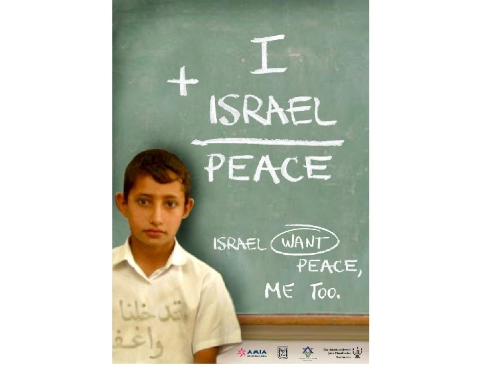 OTROS TRABAJOS PRESENTADOS EDUCACIÓN PARA LA PAZ Participantes: Adrián Tenembaum, Shirly Murawczyk (Buenos Aires, Argentina) Lejos de plantear la solución al conflicto en Medio Oriente como una simple ecuación matemática, el afiche nos ubica en una posición de compromiso en la que cada uno de nosotros, junto con Israel, constituye un termino irremplazable en la búsqueda de la paz. Israel sin el apoyo de todos y cada uno no podrá llegar a ese resultado