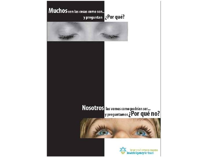 OTROS TRABAJOS PRESENTADOS POR QUÉ NO Participantes: Limor Azar, Frida Blau, Jill Ligator (Jewish Agency – Costa Rica) Tutor: Javier Basevich. Muchos ven las cosas como son. . . y preguntan “¿Por qué’”, pero no buscan una solución, prefieren cerrar los ojos o mirar hacia otro lado. A esta actitud nosotros contraponemos otra: vemos como podrían ser. . . y preguntamos “¿Por qué no? ” Nuestros ojos abiertos y mirando hacia arriba, como la mirada esperanzada de un niño. Porque sabemos que nuestro ideal es la PAZ y es lo que perseguimos.