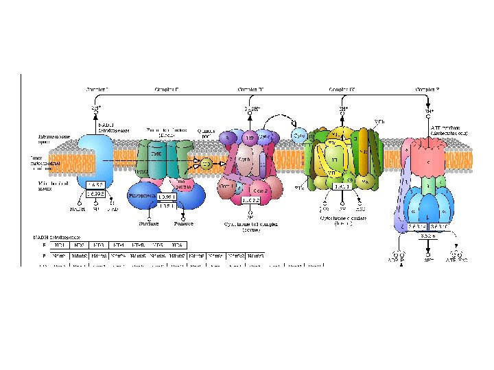 E°’ -0. 4 NADH Complejo I (DG°’= -69. 5 k. J/mol) -0. 2 0 (+0. 03 V) Succ FADH 2 Fum 0. 2 NAD+ (-0. 315 V) Complejo II Co. Q (0. 045 V) Complejo III (DG°’= -36. 7 k. J/mol) ADP+Pi Rot/amytal ATP ADP+Pi Antimicina ATP Cyt. C (0. 235 V) 0. 4 0. 6 Complejo IV (DG°’= -112 k. J/mol) 0. 8 2 H+ + ½ O 2 H 2 O (0. 815 V) ADP+Pi CNATP