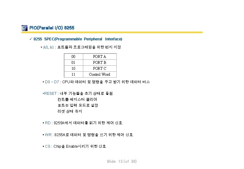 PIO(Parallel I/O) 8255 ü 8255 SPEC(Programmable Peripheral Interface) DATA CONTROL POTR A I/O PA 0 -PA 7 DATA BUFFER Port C(H) I/O PC 4 -PC 7 Port C(L) I/OPC 0 -PC 3 PORT B I/OPB 0 -PB 7 /RD /WR A 1 A 0 RESET READ WRITE CONTROL LOGIC /CS • PA 0 ∼ PA 7, PB 0 ∼ PB 7, PC 0 ∼ PC 7 : 입출력 포트 A포트 (PA 0 ∼ PA 7) B포트(PB 0 ∼ PB 7) C포트의 상위 4 Bit (C 4∼C 7) C포트의 하위 4 Bit (C 0∼C 3) Slide 12 (of 28)