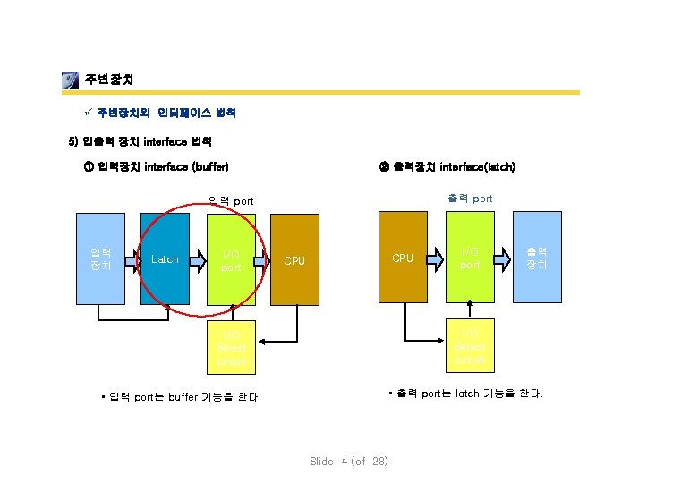 주변장치 ü I/O Port map (1) 4바이트 단위 I/O 영역 분할을 Decoder로 설계하는 방법 A 7 A 6 A 5 A 4 A 3 A 2 A 1 A 0 영역 0 0 0 x x 000 H 0 0 0 1 1 1 x x 01 FH DECODER 선택 DECODER 입력 I/O device address I/O #1 00 H-03 H I/O #2 04 H-07 H I/O #3 08 H-0 BH I/O #4 0 CH-0 FH I/O #5 10 H-13 H I/O #6 14 H-17 H • DECODER를 이용한 4바이트 단위 분할 I/O #7 18 H-1 BH I/O #8 1 CH-1 FH Slide 7 (of 28)