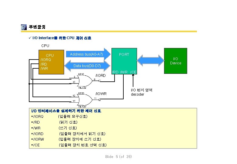 주변장치 ü I/O Interfacing bus system • I/O interface bus system Address Microprocessor System Data I/O device #1 I/O device #2 Control I/O device #3 • I/O interface 신호 (1) Address : memory A 0 -A 15 I/O A 0 -A 7 (2) Data : D 0 -D 7 (3) Control : ① MEMR ② MEMW ③ IOR ④ IOW Slide 6 (of 28)