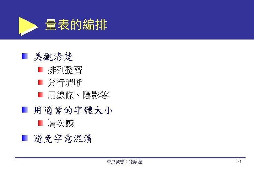 Components of Questionnaires 中央資管:范錚強 30