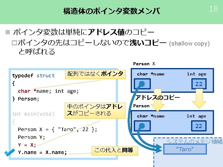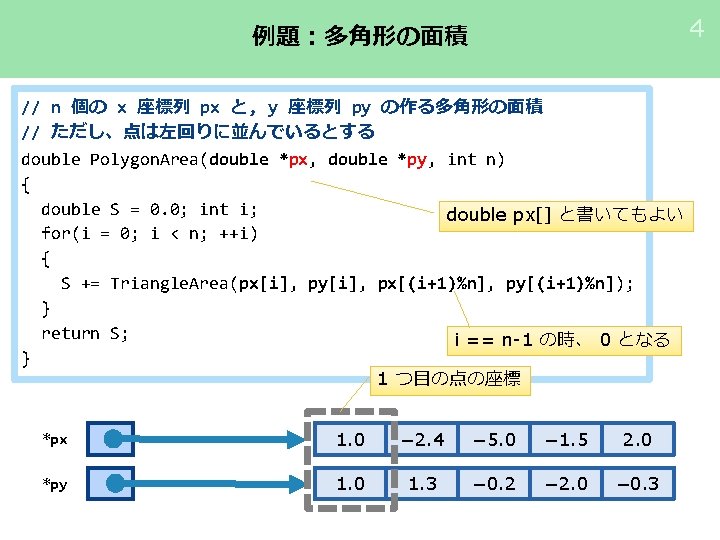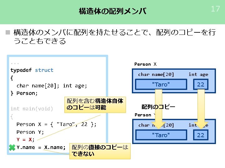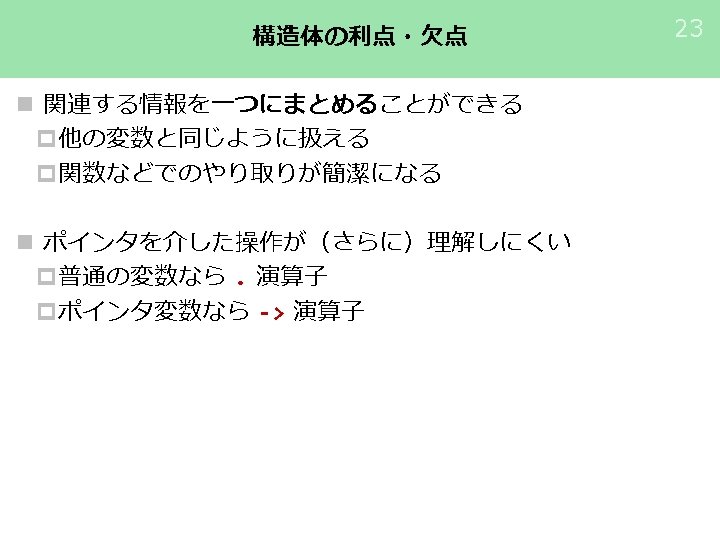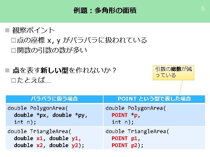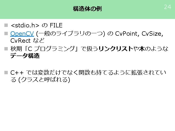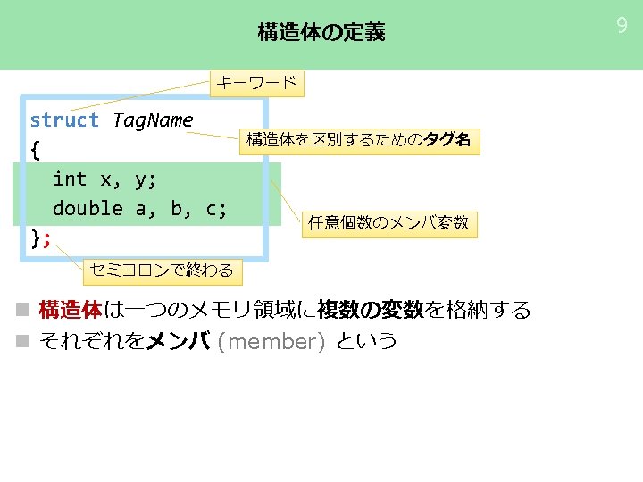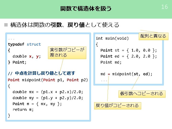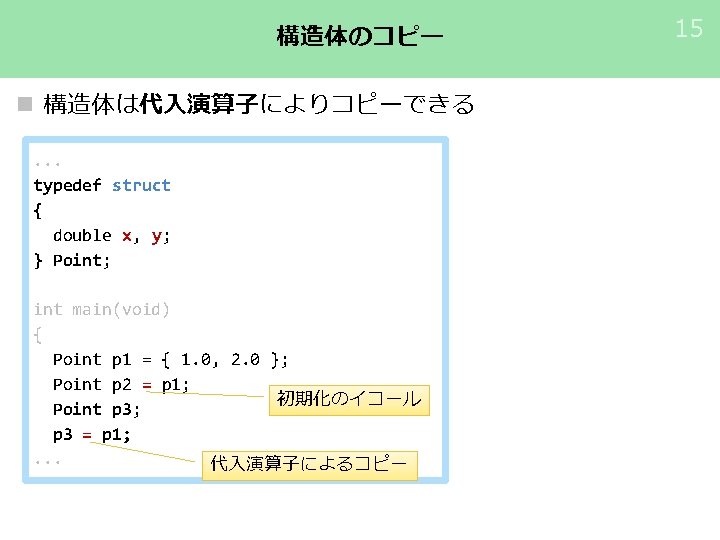 14 構造体のアクセス n 構造体のメンバは. 演算子を使う. . . typedef struct { double x, y; } Point; struct Point p 1 double x 1. 0 double y 2. 0 メンバ変数を読む int main(void) メンバ変数に代入する { Point p 1 = { 1. 0, 2. 0 }; printf("p 1=(%f, %f)n", p 1. x, p 1. y); p 1. x = -p 1. y; printf("p 1=(%f, %f)n", p 1. x, p 1. y); . . . 出力 p 1=(1. 000000, 2. 000000) p 1=(-2. 000000, 2. 000000)
