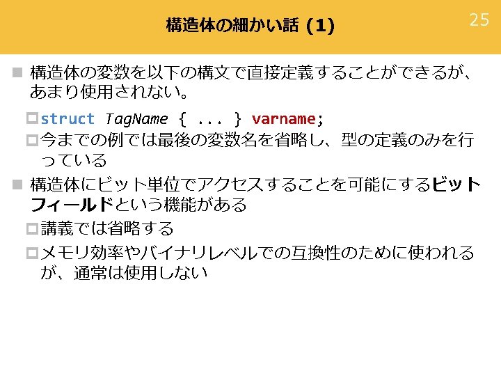 10 構造体型の変数. . . struct Point { double x, y; }; int main(void) { struct Point p 1, p 2; . . . メモリ上のレイアウ ト(順番や隙間の大 きさ)は環境による struct Point p 1 double x double y struct Point p 2 double x 「struct + タグ名」で 一つの型名を構成する n 型名として "struct Tag. Name" を使う double y